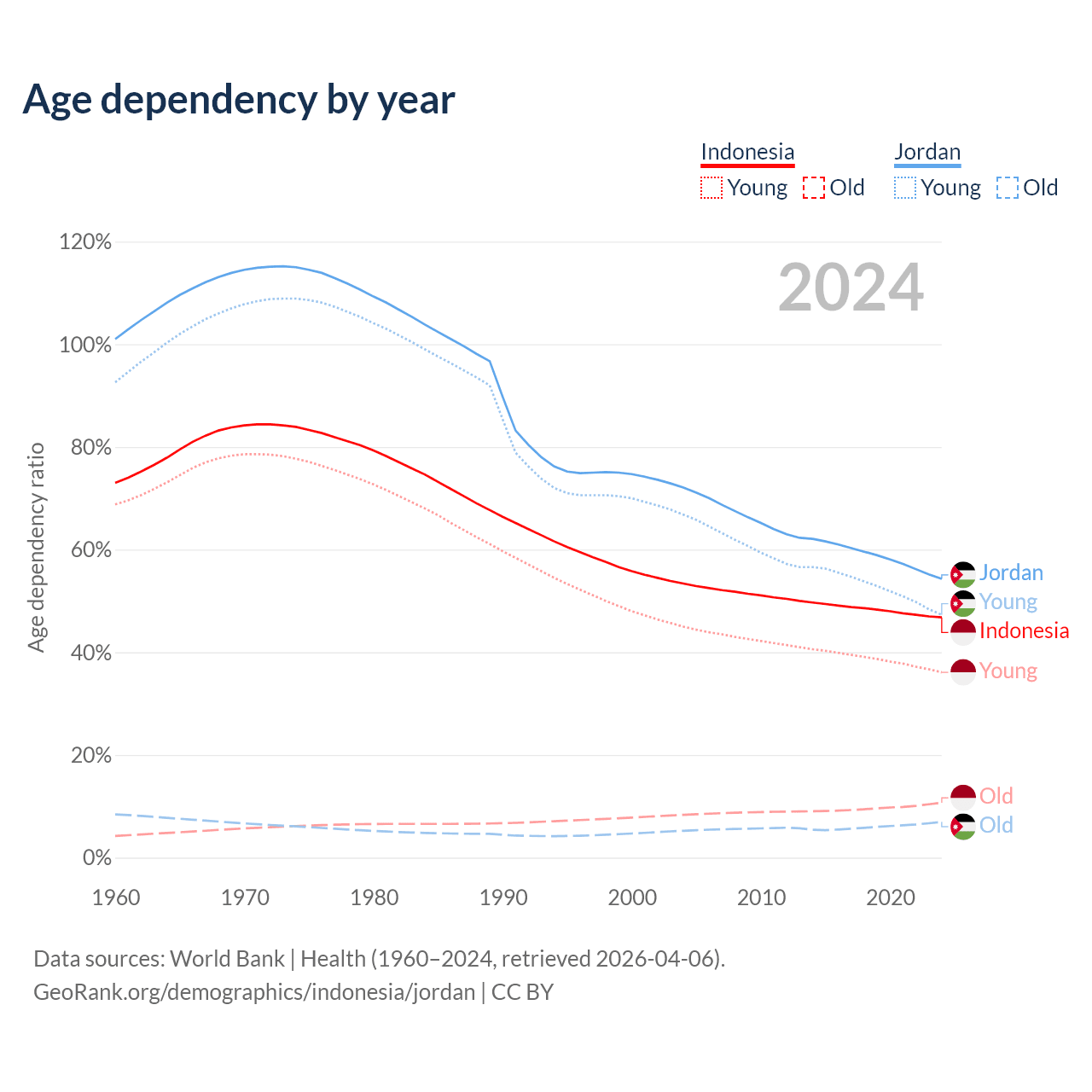 - Indonesia is ranked 93/196 by median age (oldest to youngest) vs 131/196 for Jordan.