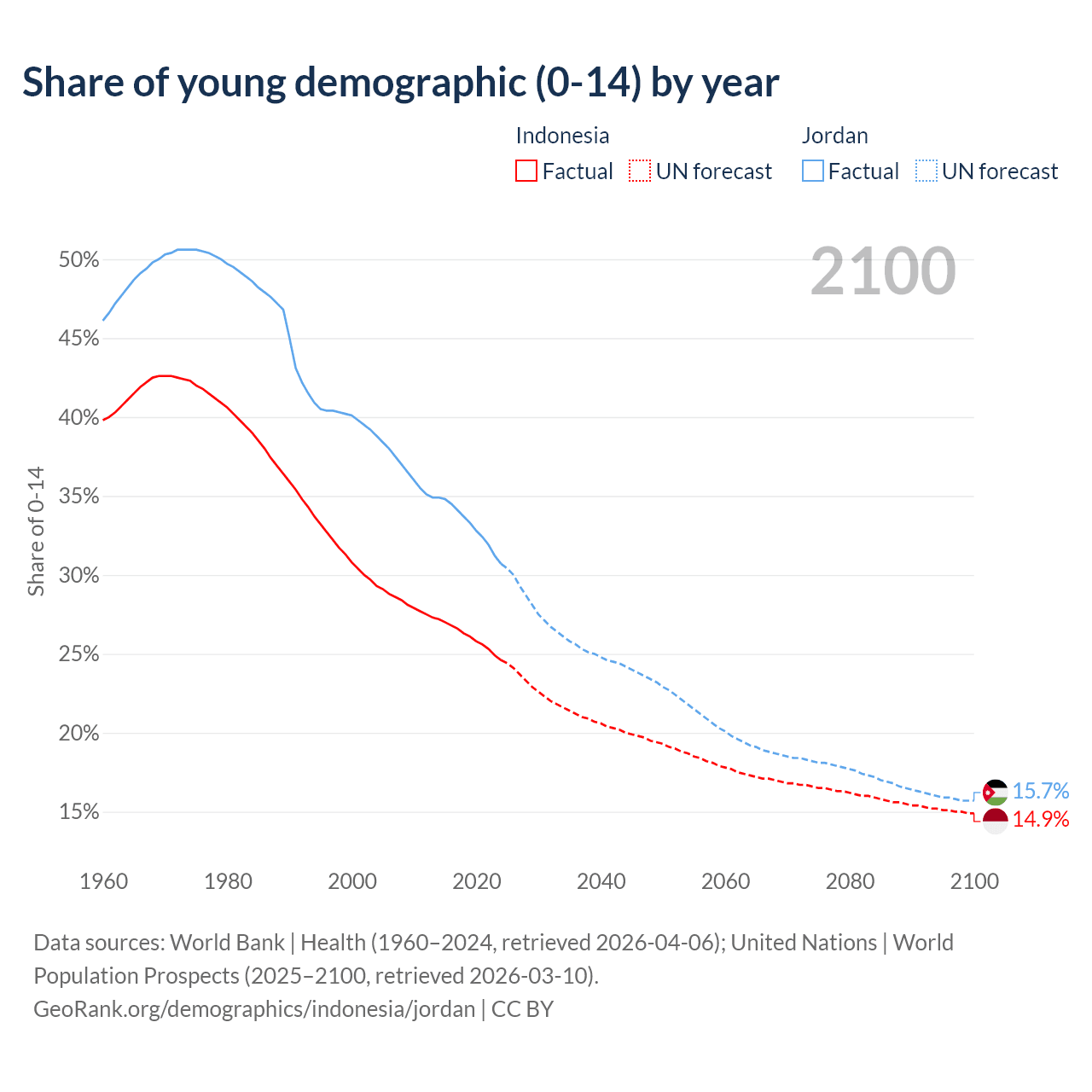 - The share of young demographic (0-15 years old) in Indonesia is 24.6% vs 30.7% in Jordan.