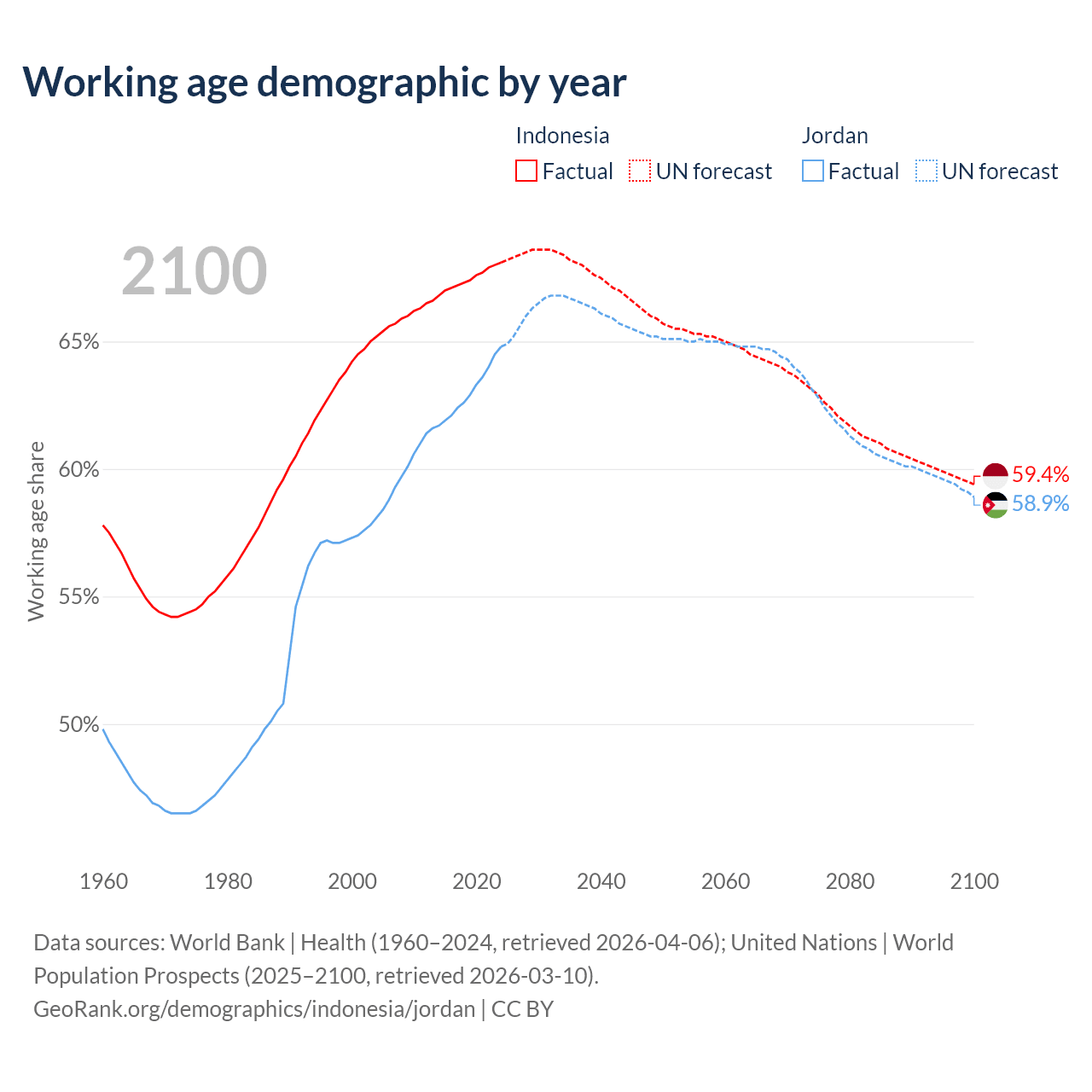 - As of 2026, the population of Indonesia is 289M vs 11.6M in Jordan - 25 times difference.