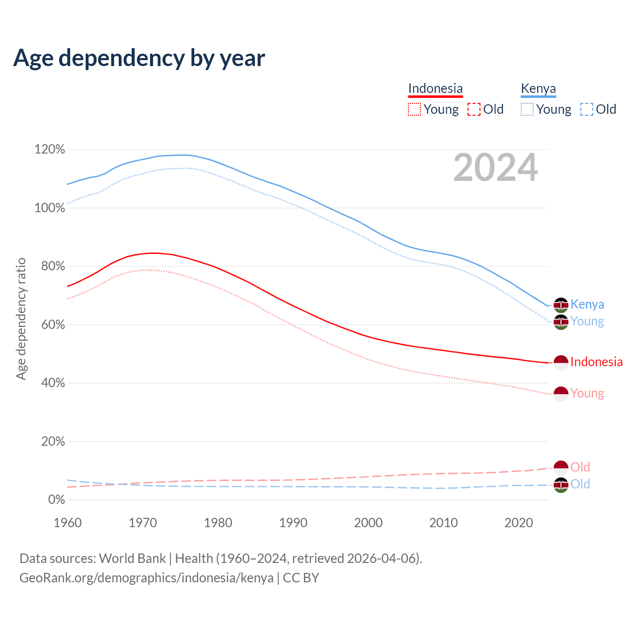 Data sources: World Bank | Health (1960–2024, retrieved 2026-04-06); U.S. Census Bureau (1960–2024, retrieved 2026-02-08).