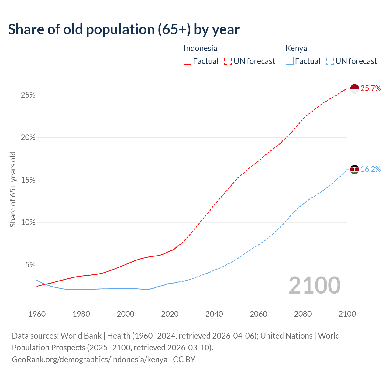 The share of older people aged 65 and over is 7.29% in Indonesia and 2.97% in Kenya. Life expectancy in Indonesia compared to Kenya .