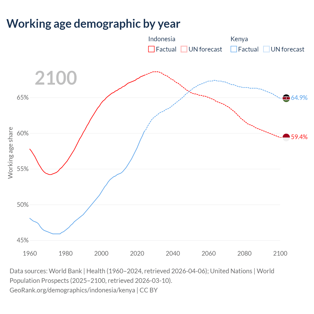 Median age Indonesia vs Kenya, 1960-2100