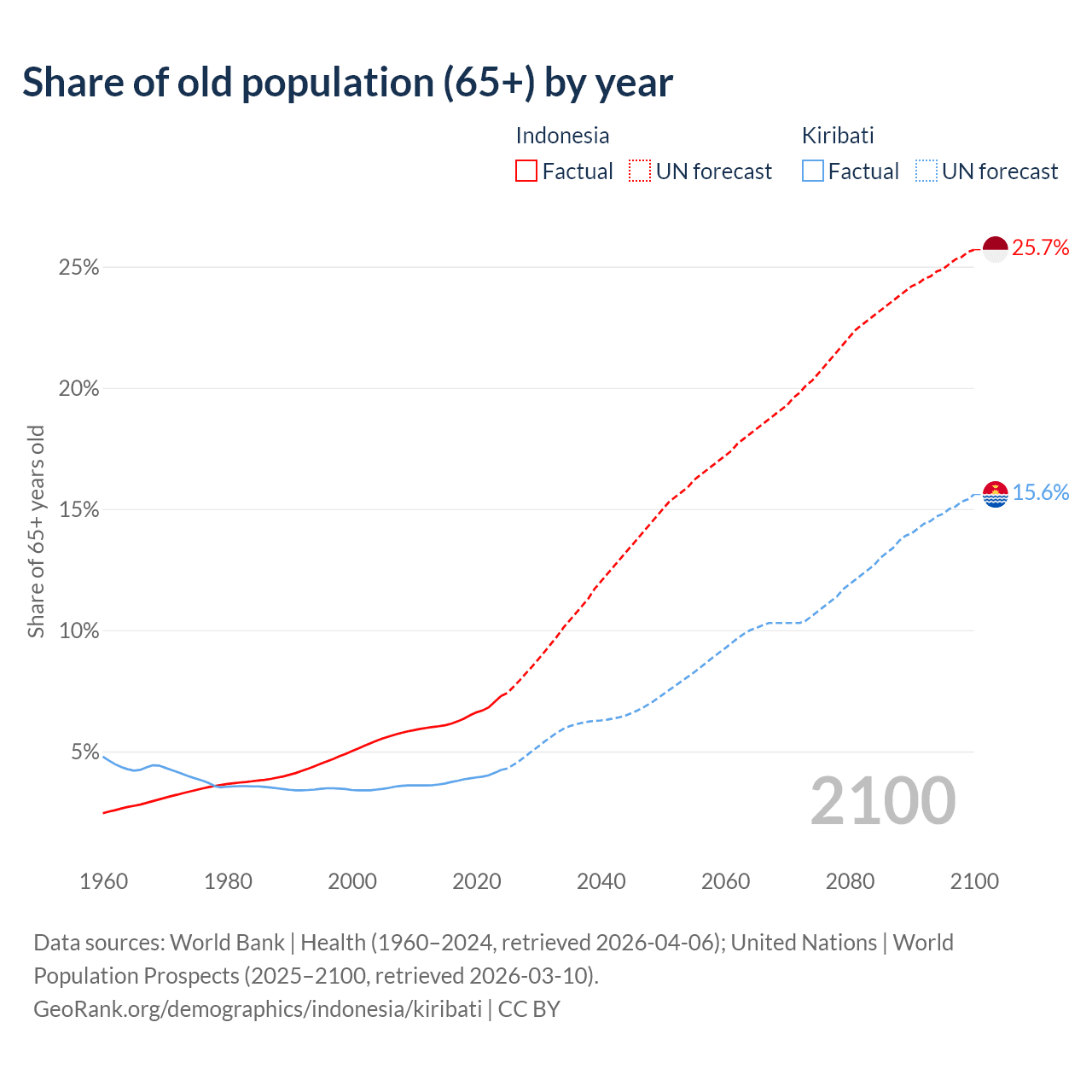 - The share of old-age demographic (65+) in Indonesia is 7.29% vs 4.24% in Kiribati.