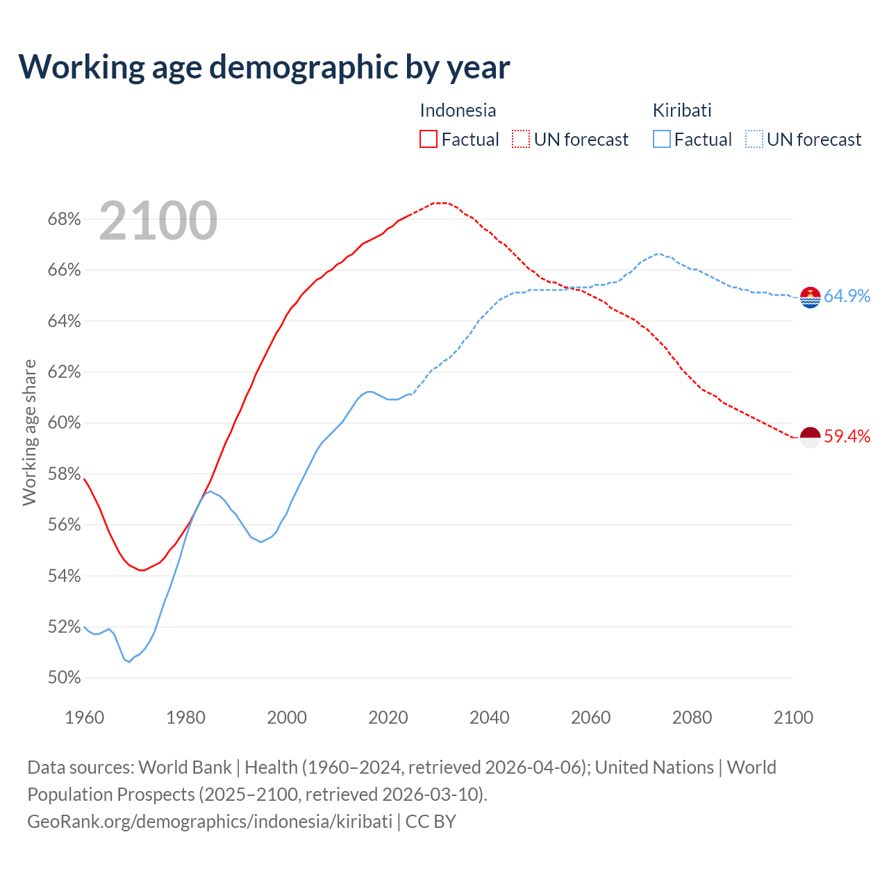 - Indonesia has 197M working age adults (aged 15-64) vs 84.9K in Kiribati.