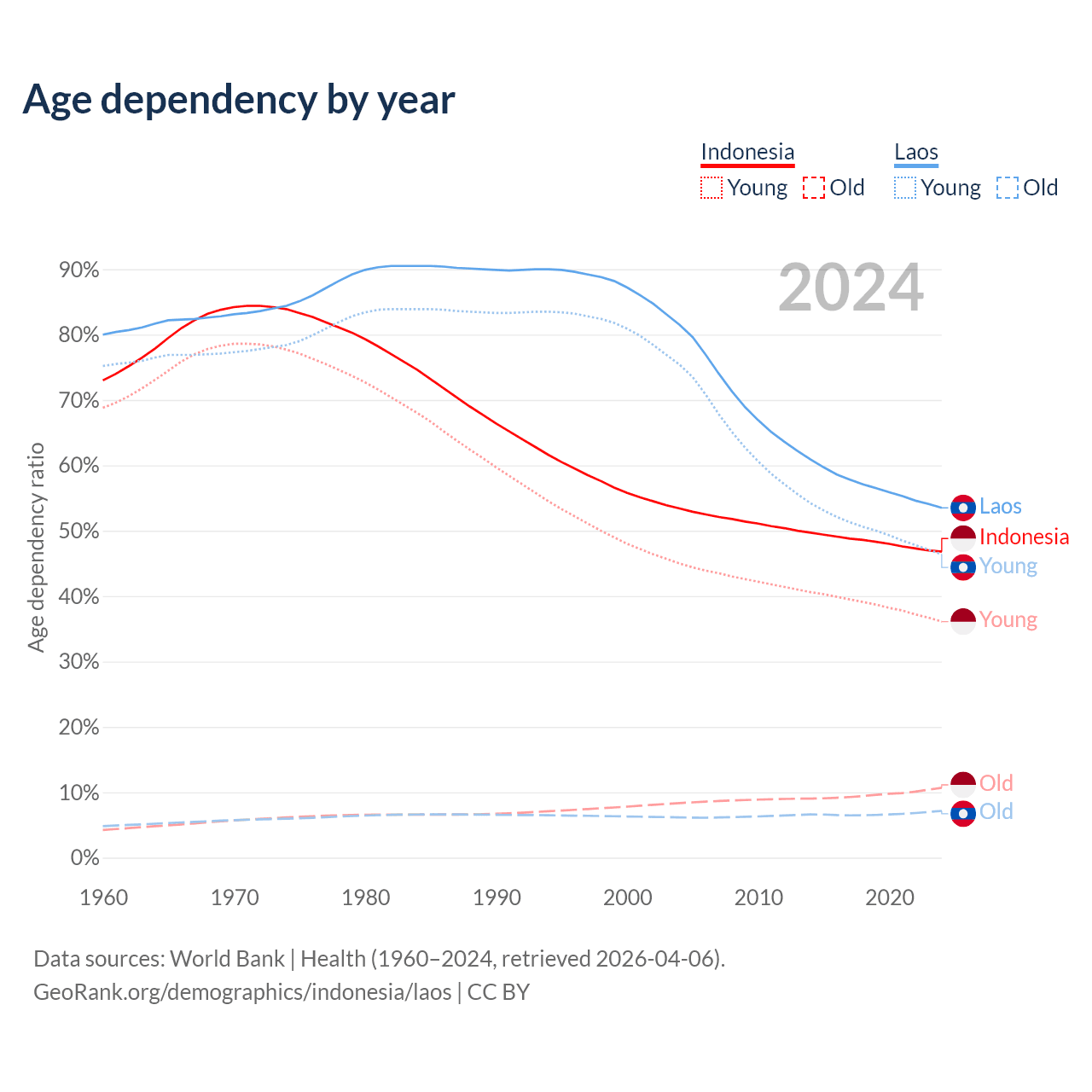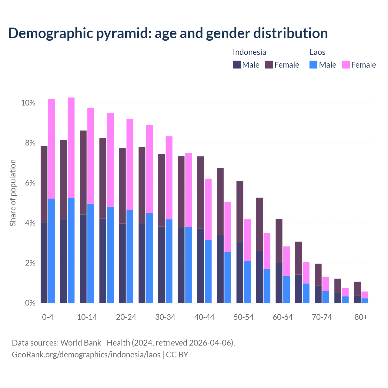 - Indonesia is ranked 93/196 by median age (oldest to youngest) vs 130/196 for Laos.