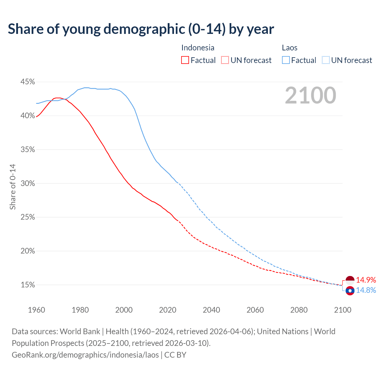 - As of 2026, the population of Indonesia is 289M vs 8M in Laos - 36 times difference.