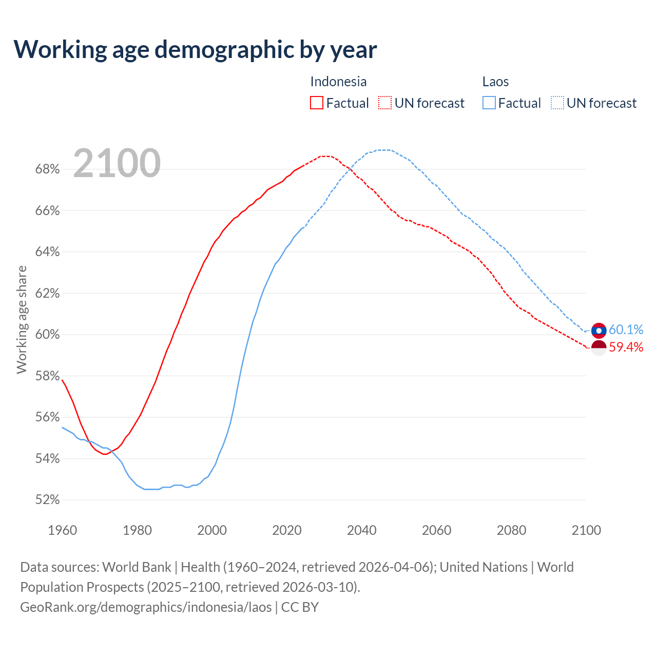- Indonesia has 197M working age adults (aged 15-64) vs 5.21M in Laos.