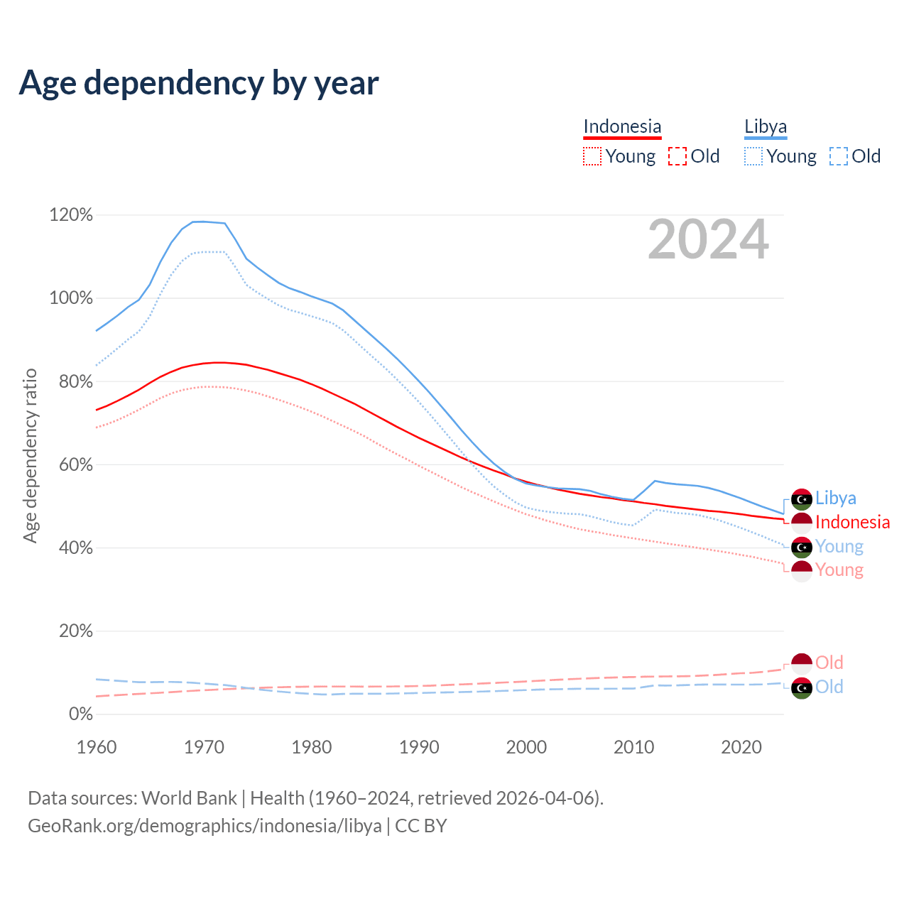 Data sources: World Bank | Health (1960–2024, retrieved 2026-04-06); U.S. Census Bureau (1960–2024, retrieved 2026-02-08).