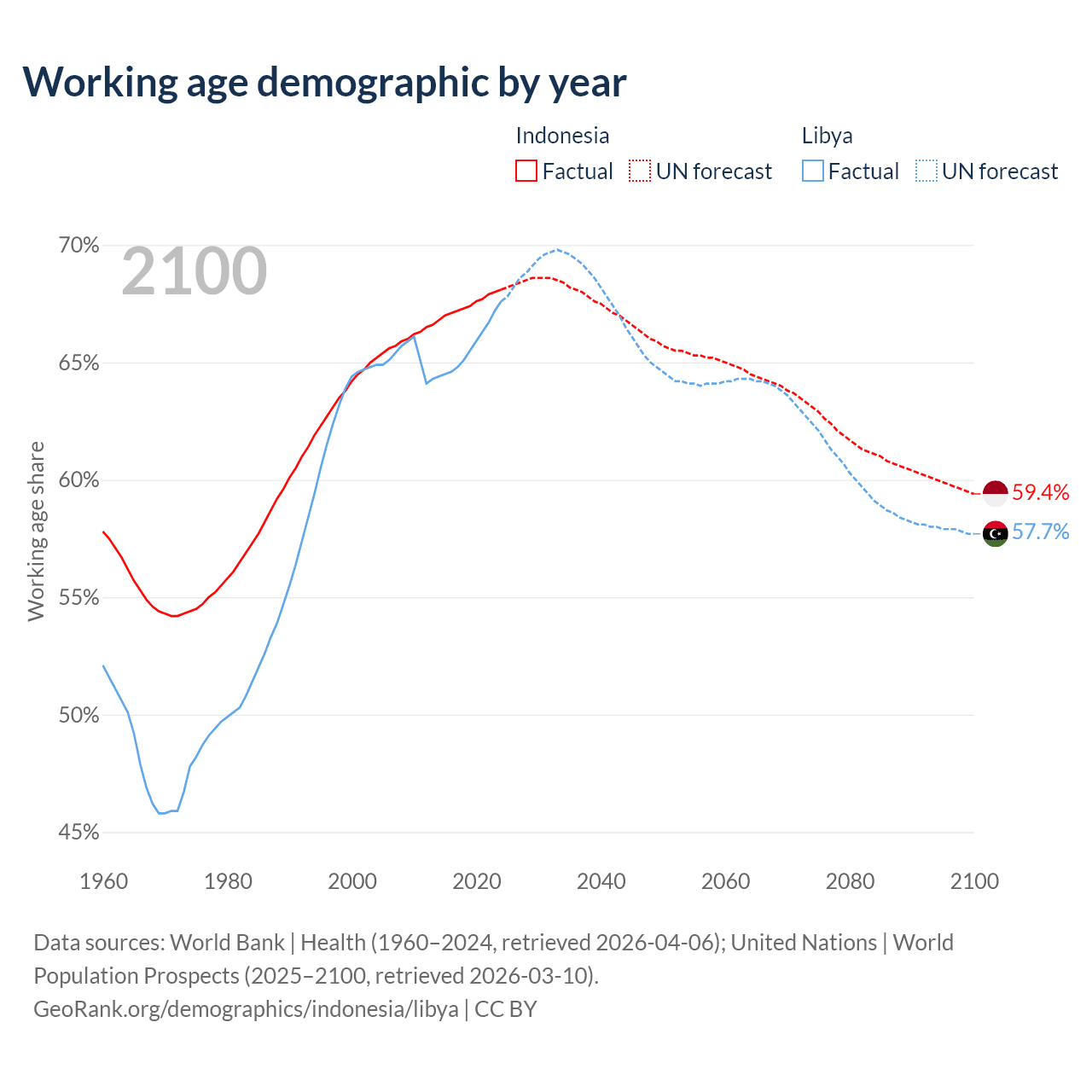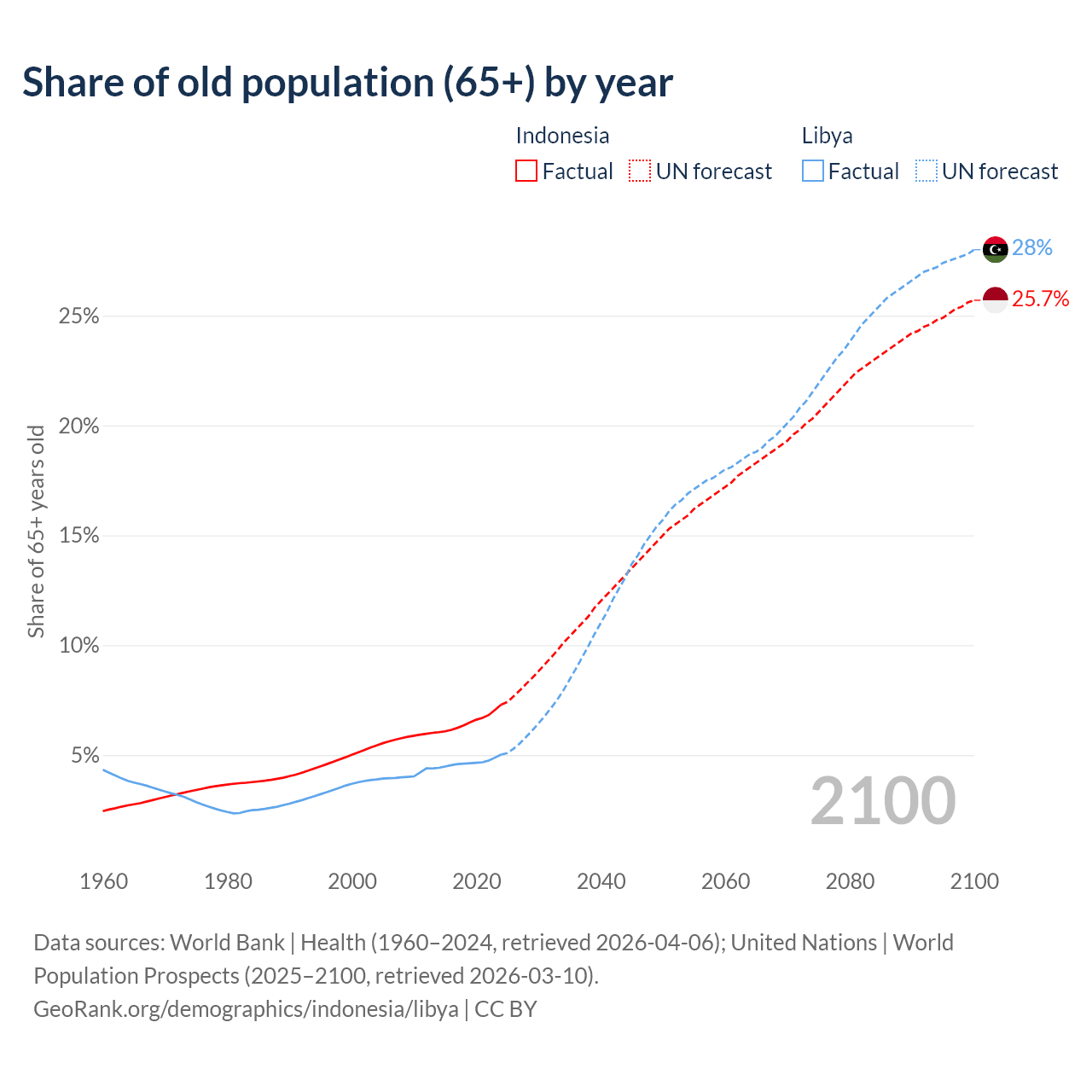 The share of older people aged 65 and over is 7.29% in Indonesia and 5.02% in Libya. Life expectancy in Indonesia compared to Libya .