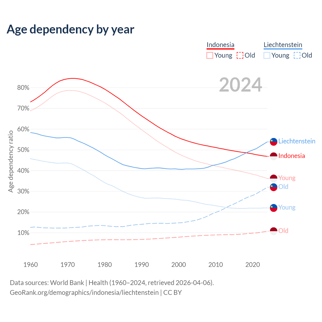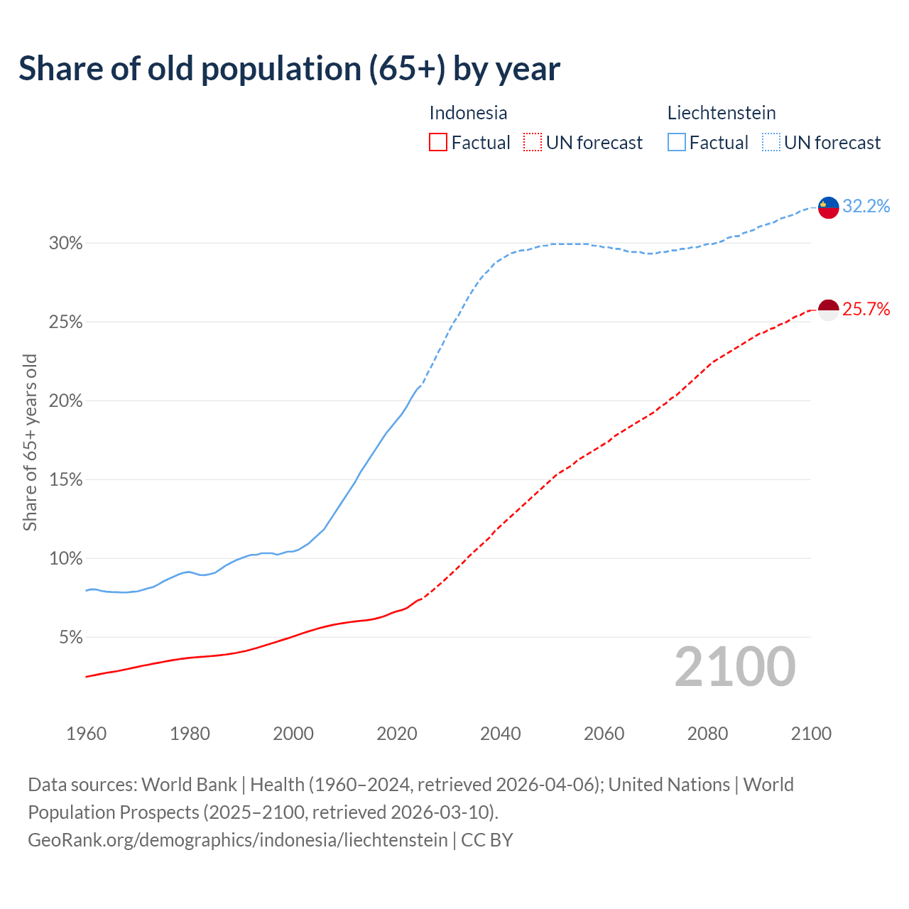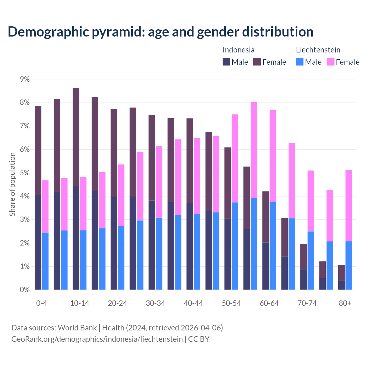 - The share of old-age demographic (65+) in Indonesia is 7.29% vs 20.7% in Liechtenstein.