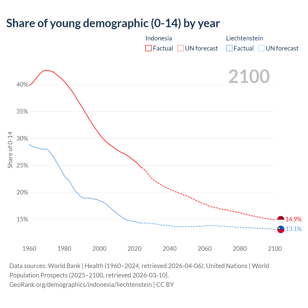 - The share of young demographic (0-15 years old) in Indonesia is 24.6% vs 14.3% in Liechtenstein.