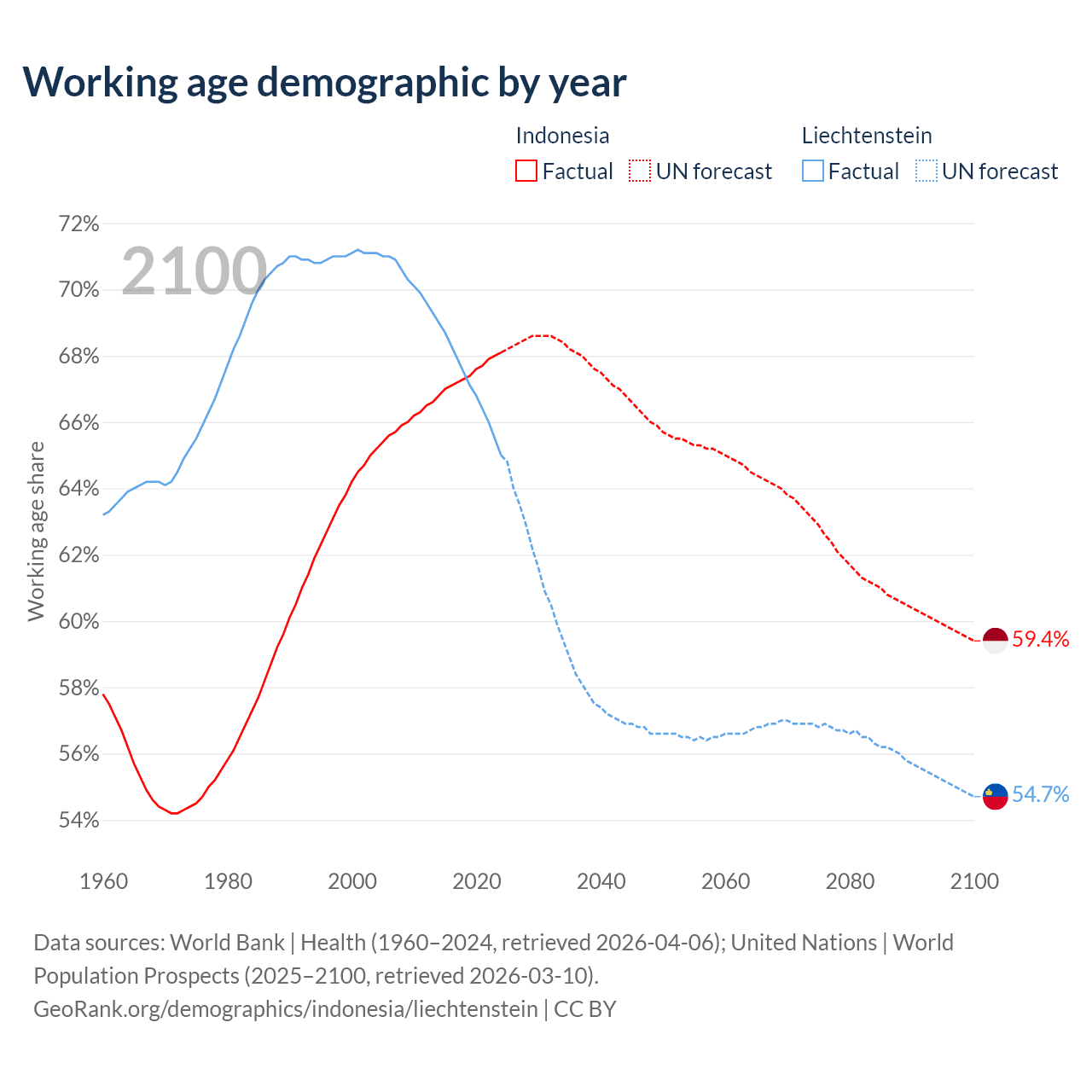 Median age Indonesia vs Liechtenstein, 1960-2100