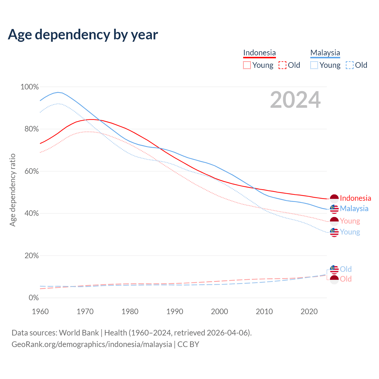 - Indonesia is ranked 93/196 by median age (oldest to youngest) vs 92/196 for Malaysia.