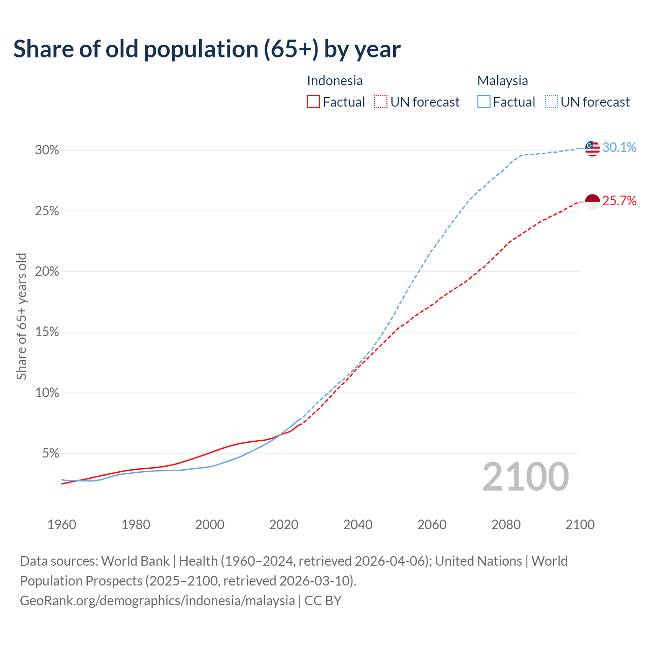 The share of older people aged 65 and over is 7.29% in Indonesia and 7.74% in Malaysia. Life expectancy in Indonesia compared to Malaysia .