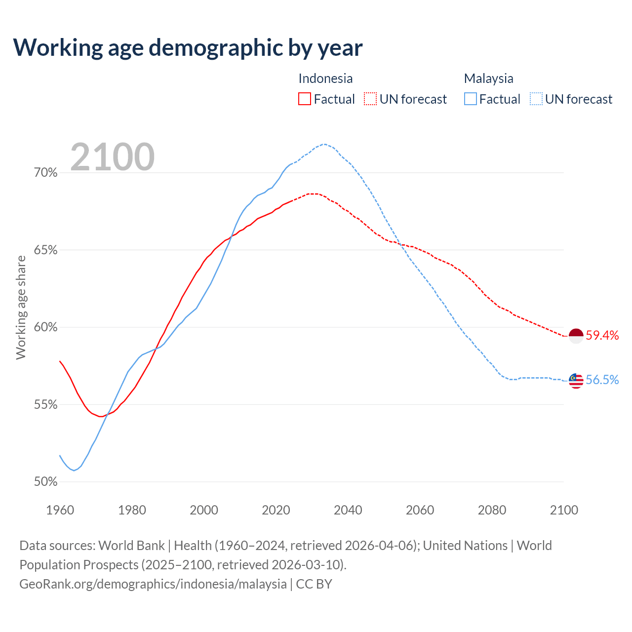 - Indonesia has 197M working age adults (aged 15-64) vs 25.7M in Malaysia.