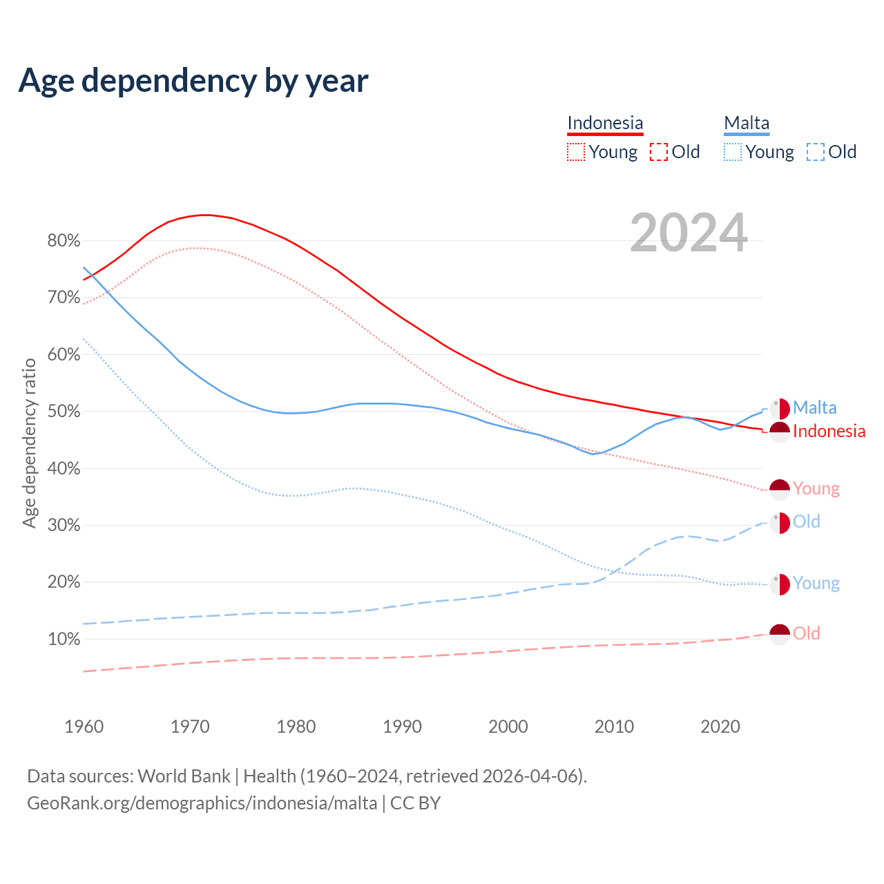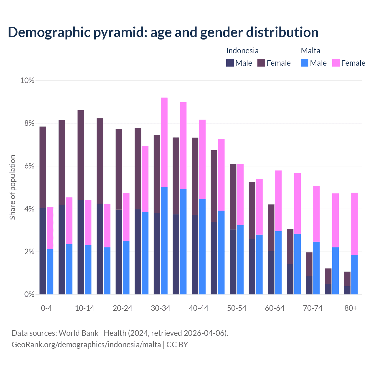 - Indonesia is ranked 93/196 by median age (oldest to youngest) vs 36/196 for Malta.