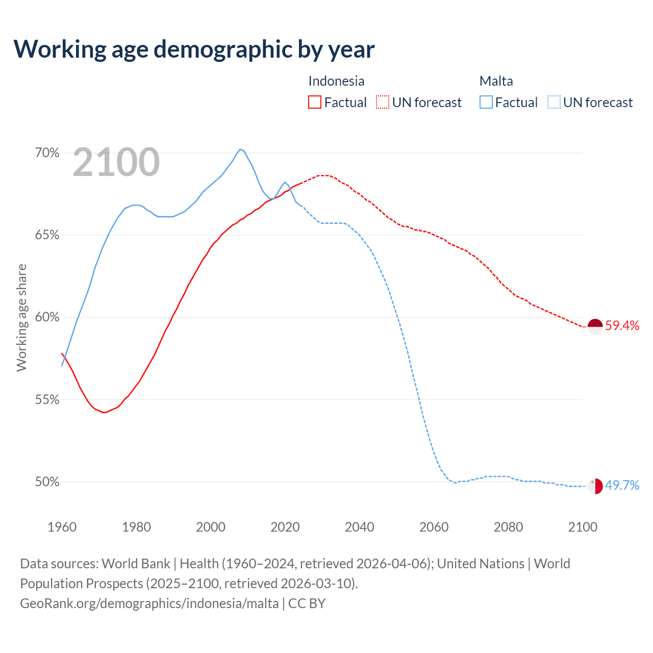 - Indonesia has 197M working age adults (aged 15-64) vs 388K in Malta.