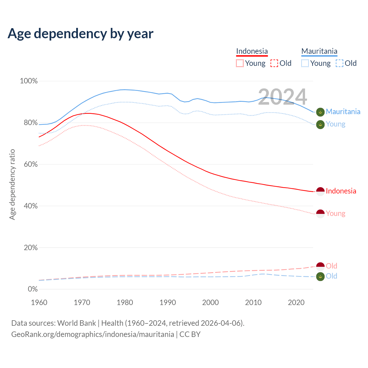 Data sources: World Bank | Health (1960–2024, retrieved 2026-04-06); U.S. Census Bureau (1960–2024, retrieved 2026-02-08).