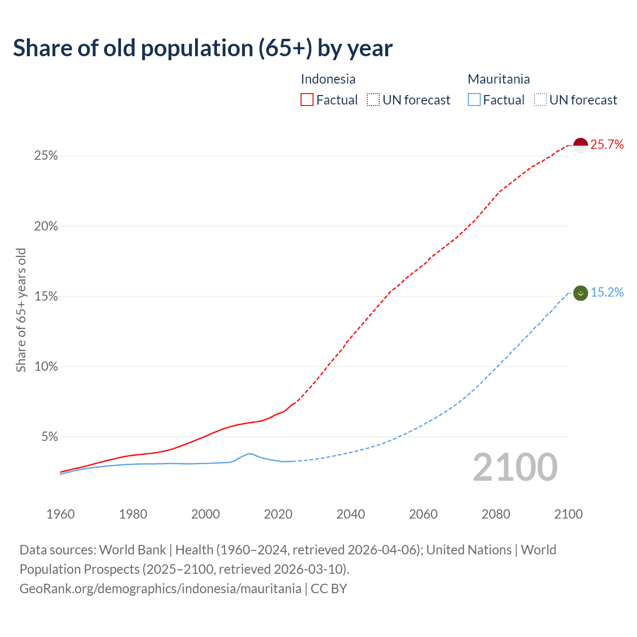 The share of older people aged 65 and over is 7.29% in Indonesia and 3.23% in Mauritania. Life expectancy in Indonesia compared to Mauritania .