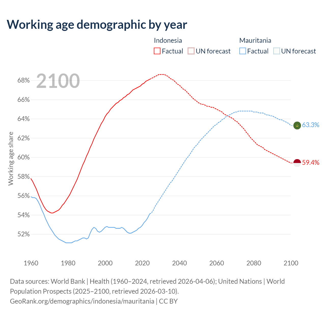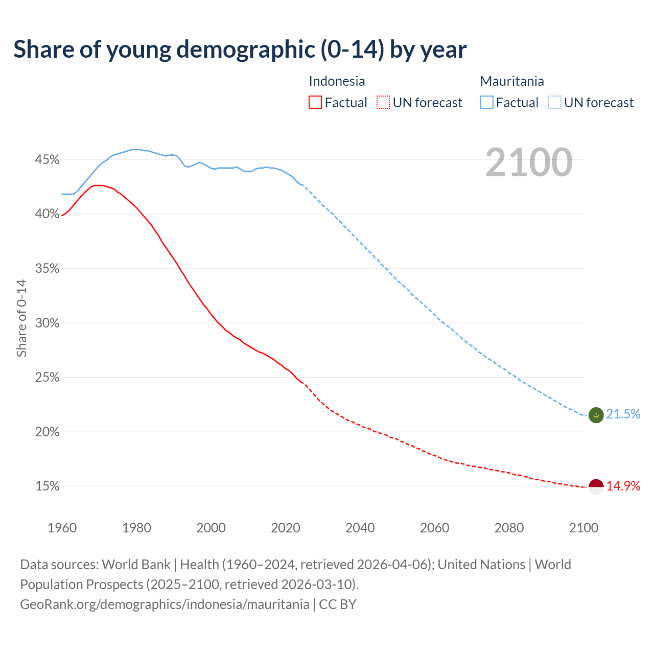 Median age Indonesia vs Mauritania, 1960-2100