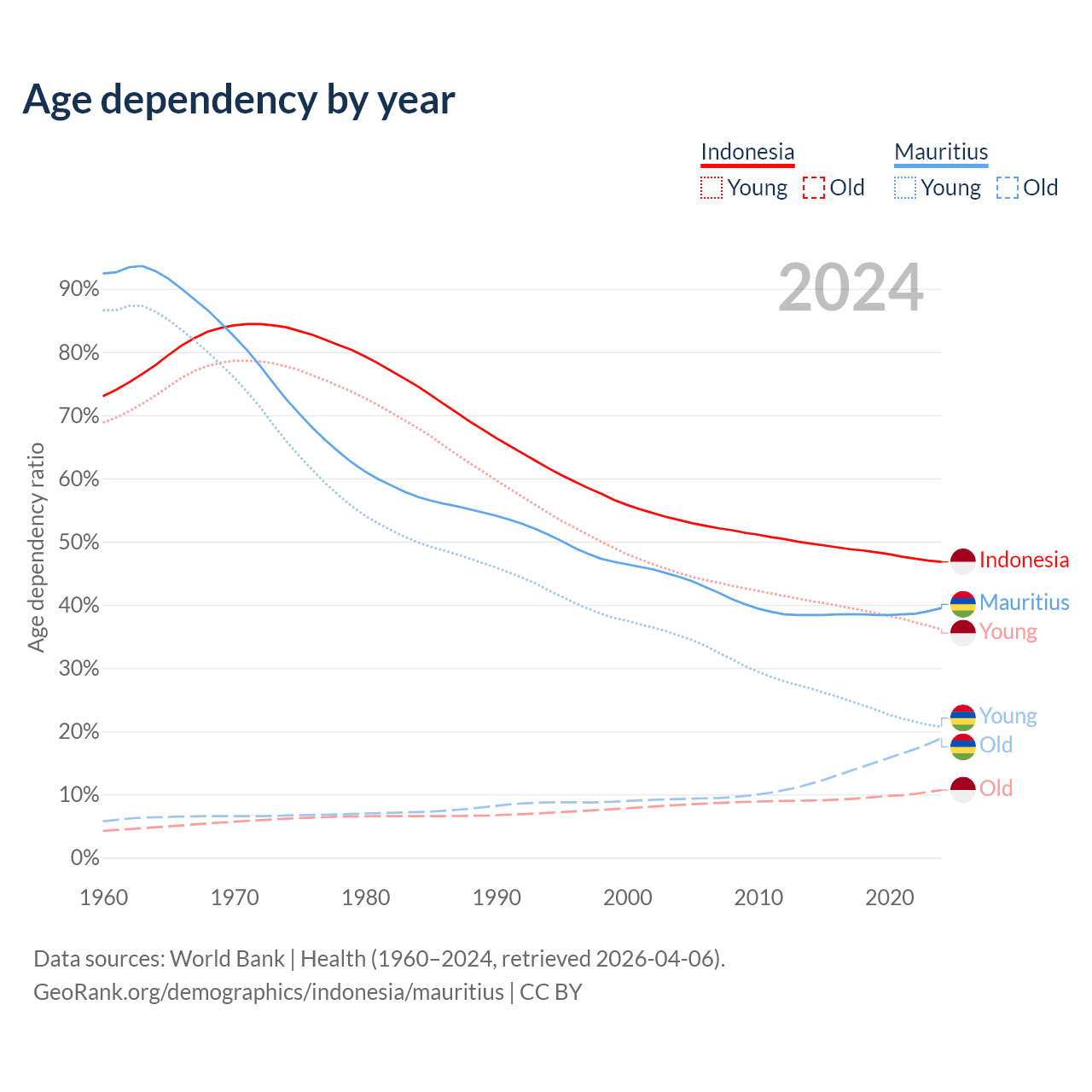 - Indonesia is ranked 93/196 by median age (oldest to youngest) vs 57/196 for Mauritius.