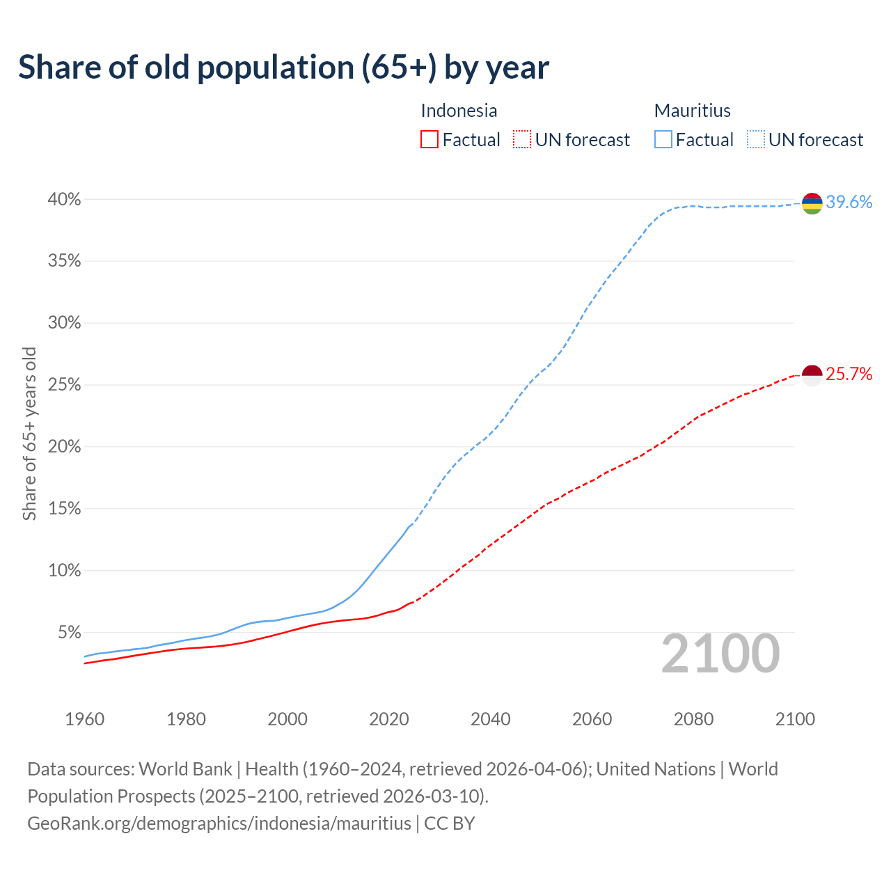The share of older people aged 65 and over is 7.29% in Indonesia and 13.5% in Mauritius. Life expectancy in Indonesia compared to Mauritius .