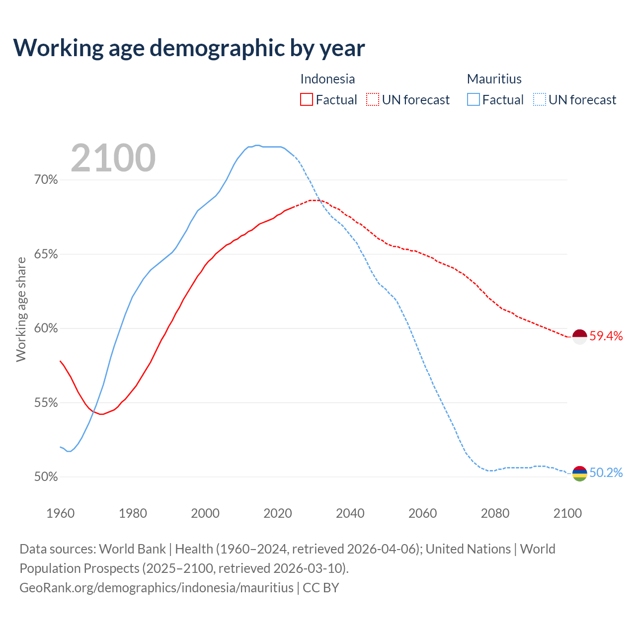 - Indonesia has 197M working age adults (aged 15-64) vs 889K in Mauritius.