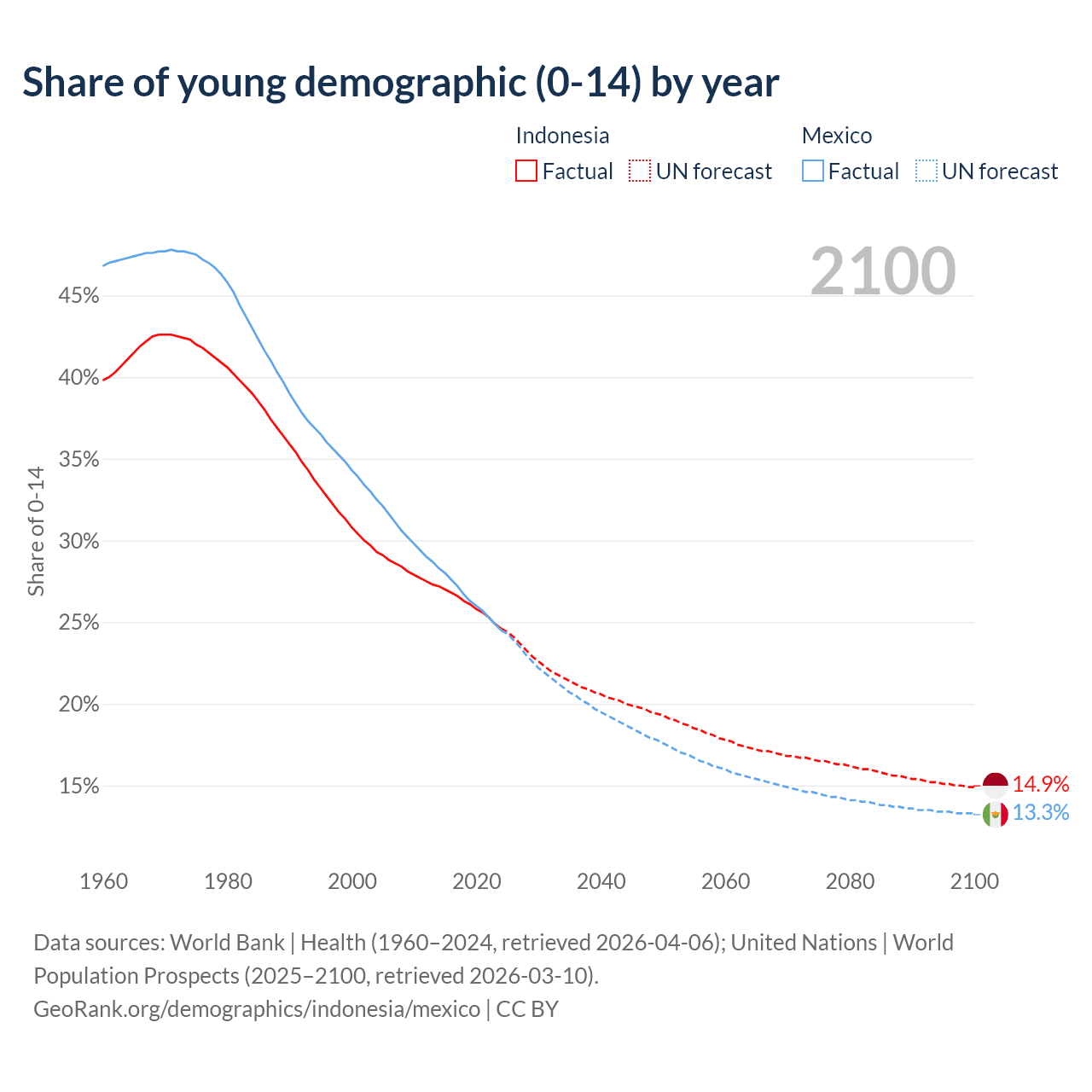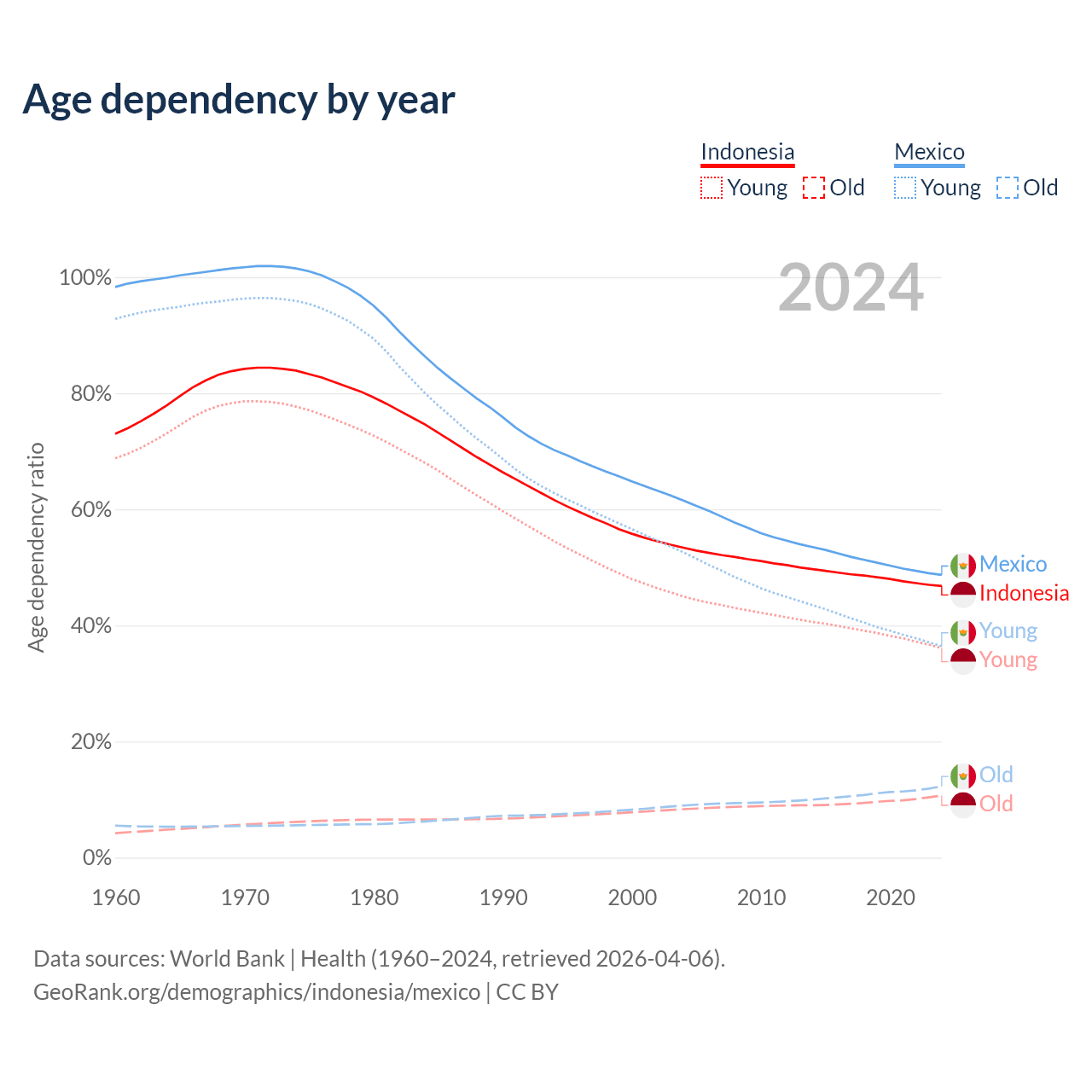 - Indonesia is ranked 93/196 by median age (oldest to youngest) vs 102/196 for Mexico.
