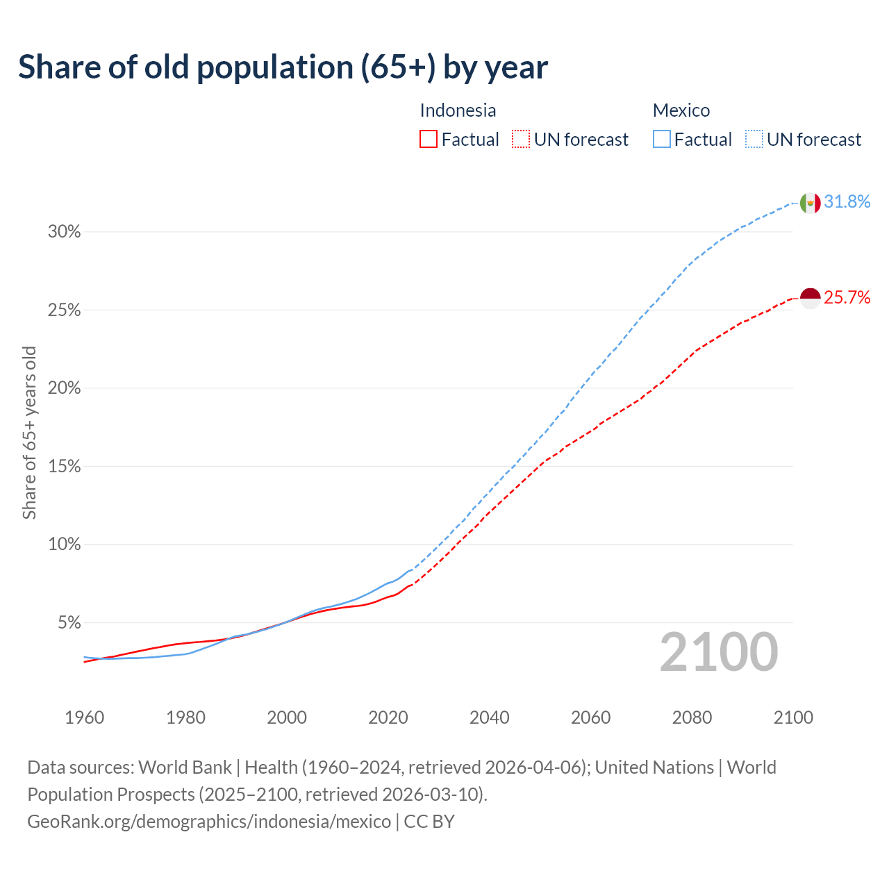 The share of older people aged 65 and over is 7.29% in Indonesia and 8.25% in Mexico. Life expectancy in Indonesia compared to Mexico .