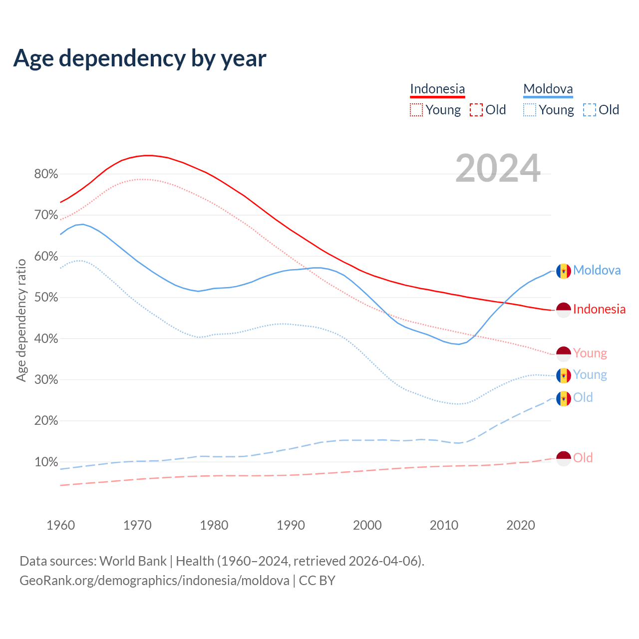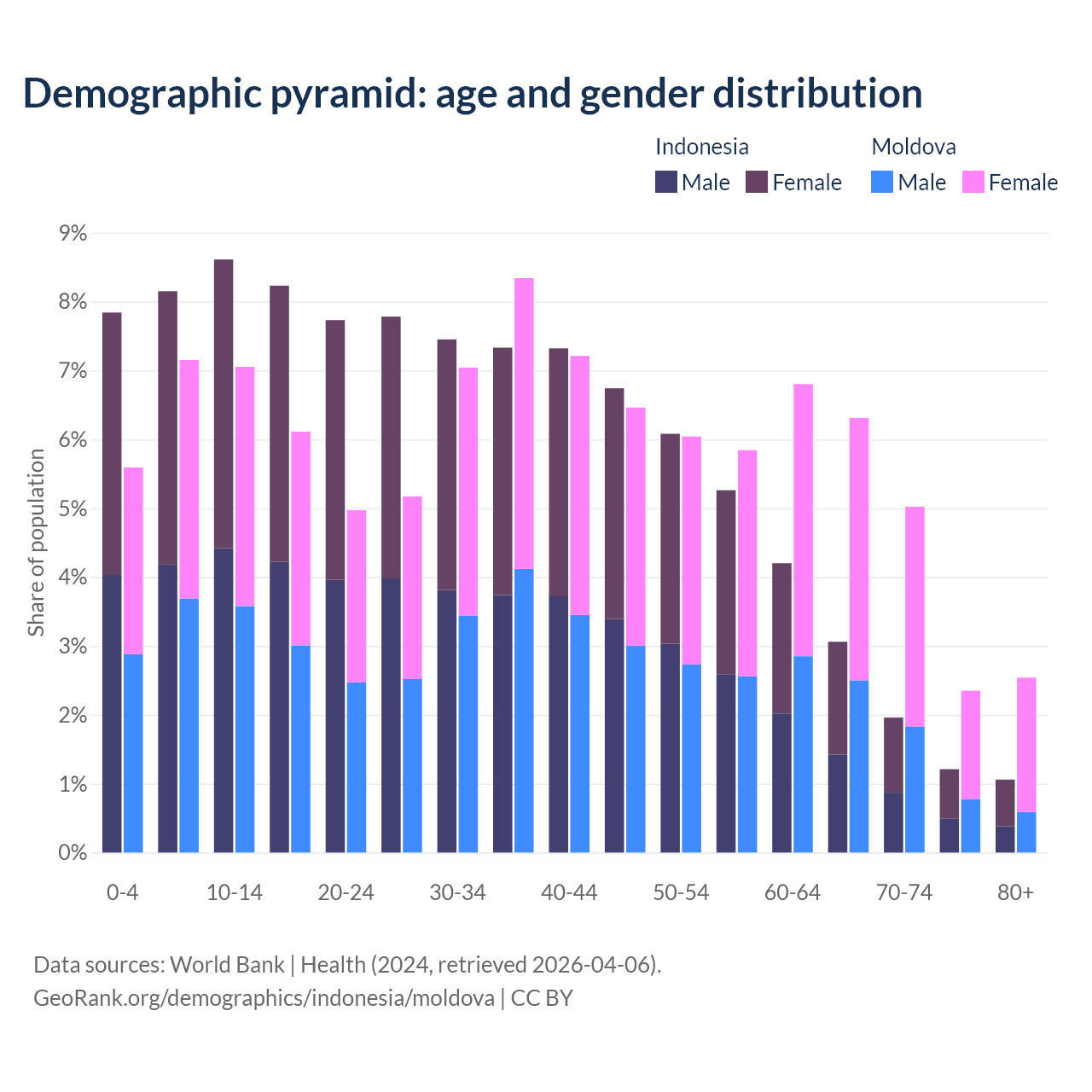- Indonesia is ranked 93/196 by median age (oldest to youngest) vs 54/196 for Moldova.