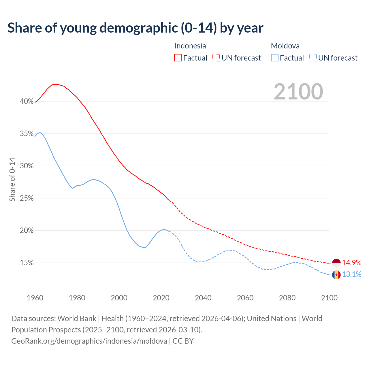- The share of young demographic (0-15 years old) in Indonesia is 24.6% vs 19.8% in Moldova.