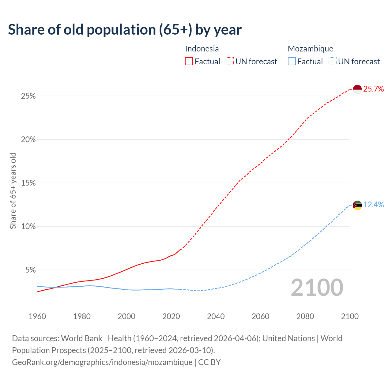The share of older people aged 65 and over is 7.29% in Indonesia and 2.75% in Mozambique. Life expectancy in Indonesia compared to Mozambique .
