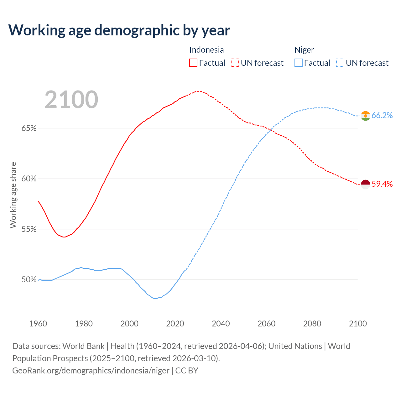 Median age Indonesia vs Niger, 1960-2100