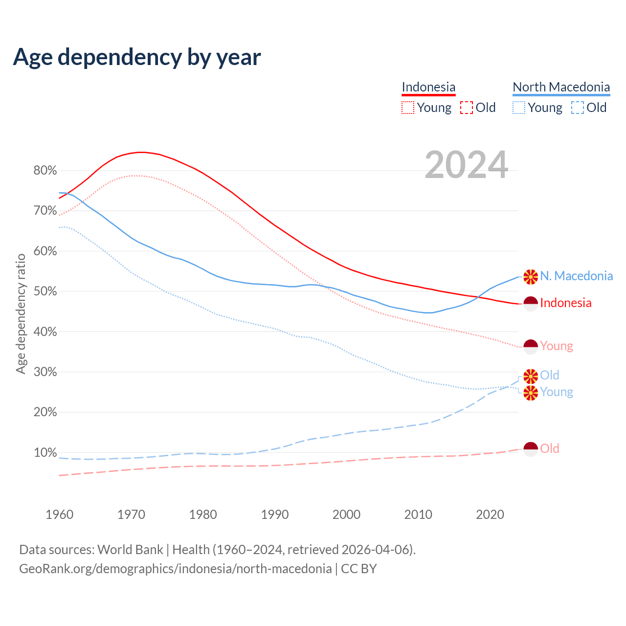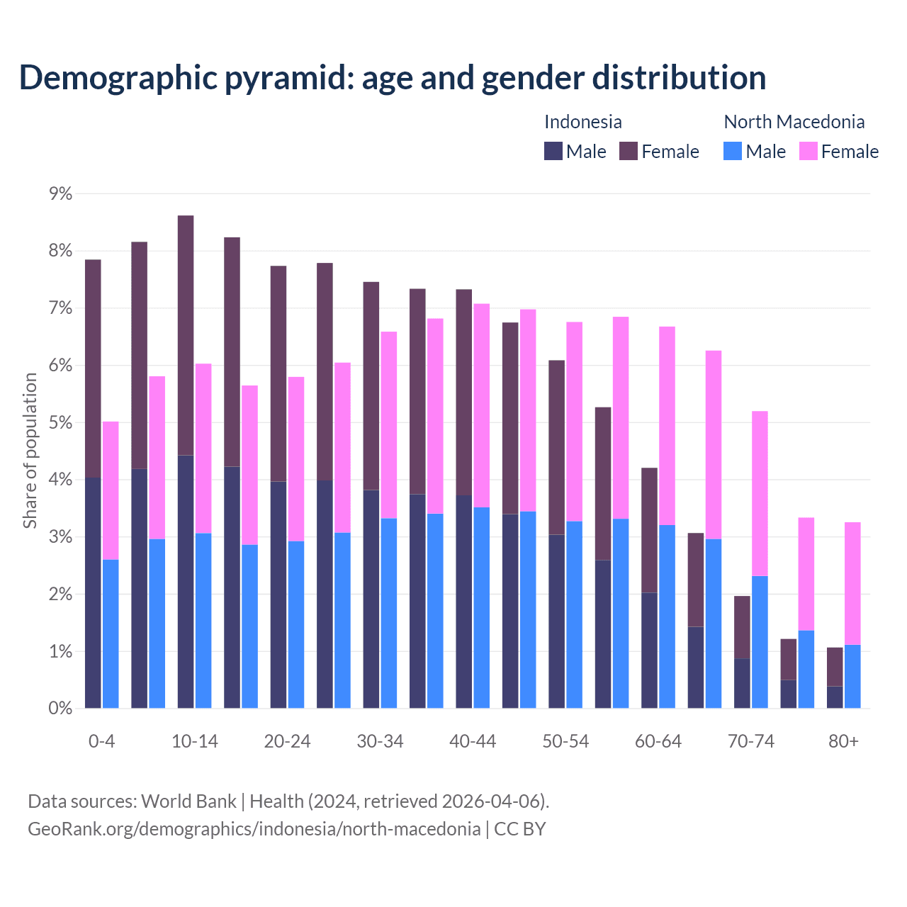 - Indonesia is ranked 93/196 by median age (oldest to youngest) vs 37/196 for North Macedonia.