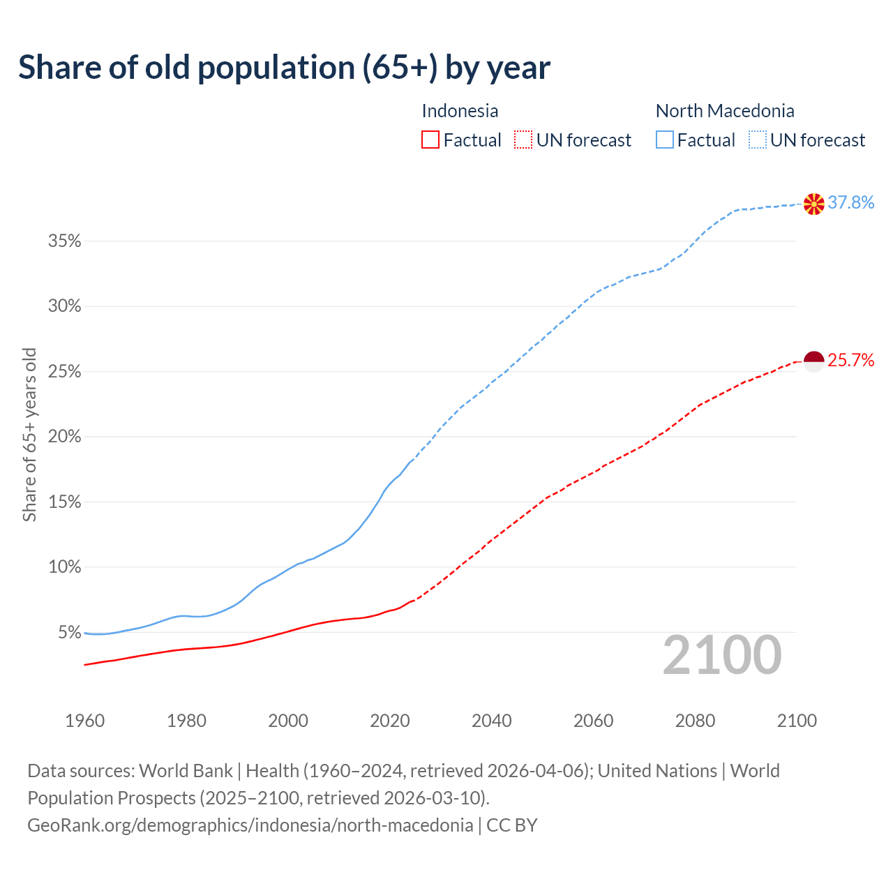 The share of older people aged 65 and over is 7.29% in Indonesia and 18% in North Macedonia. Life expectancy in Indonesia compared to North Macedonia .