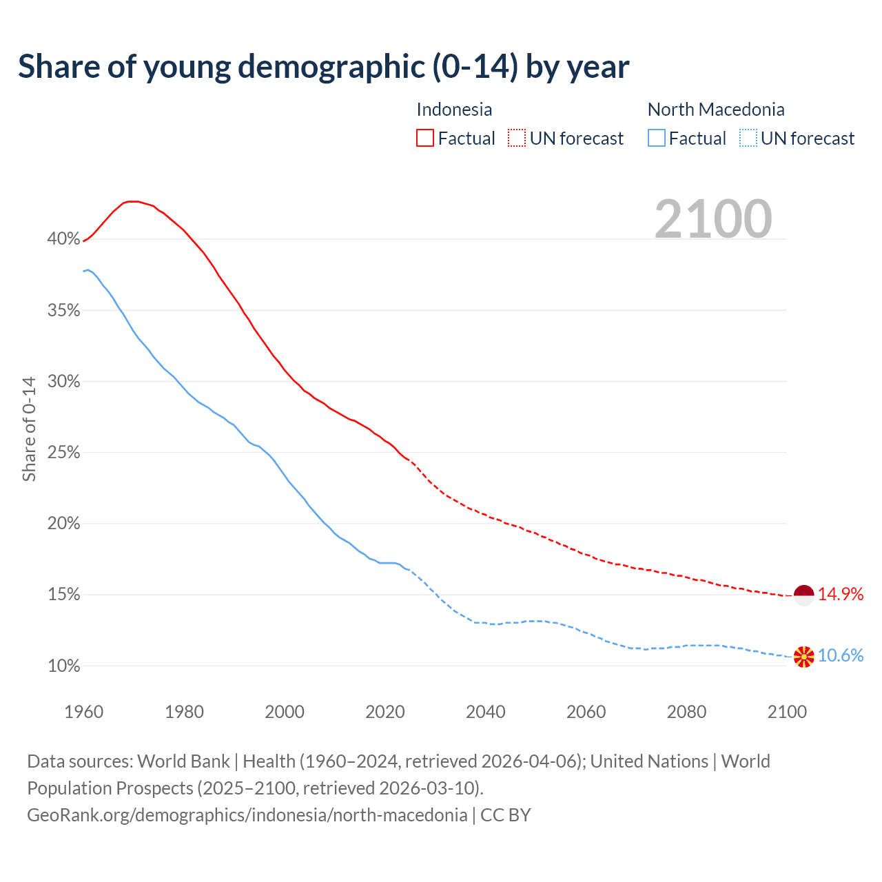 - The share of young demographic (0-15 years old) in Indonesia is 24.6% vs 16.8% in North Macedonia.