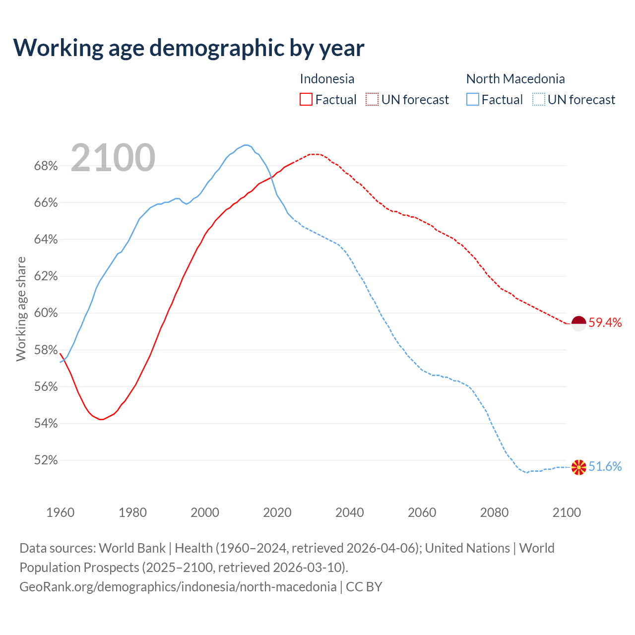 - Indonesia has 197M working age adults (aged 15-64) vs 1.18M in North Macedonia.