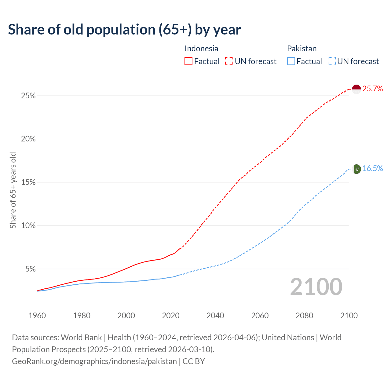Median age Indonesia vs Pakistan, 1960-2100