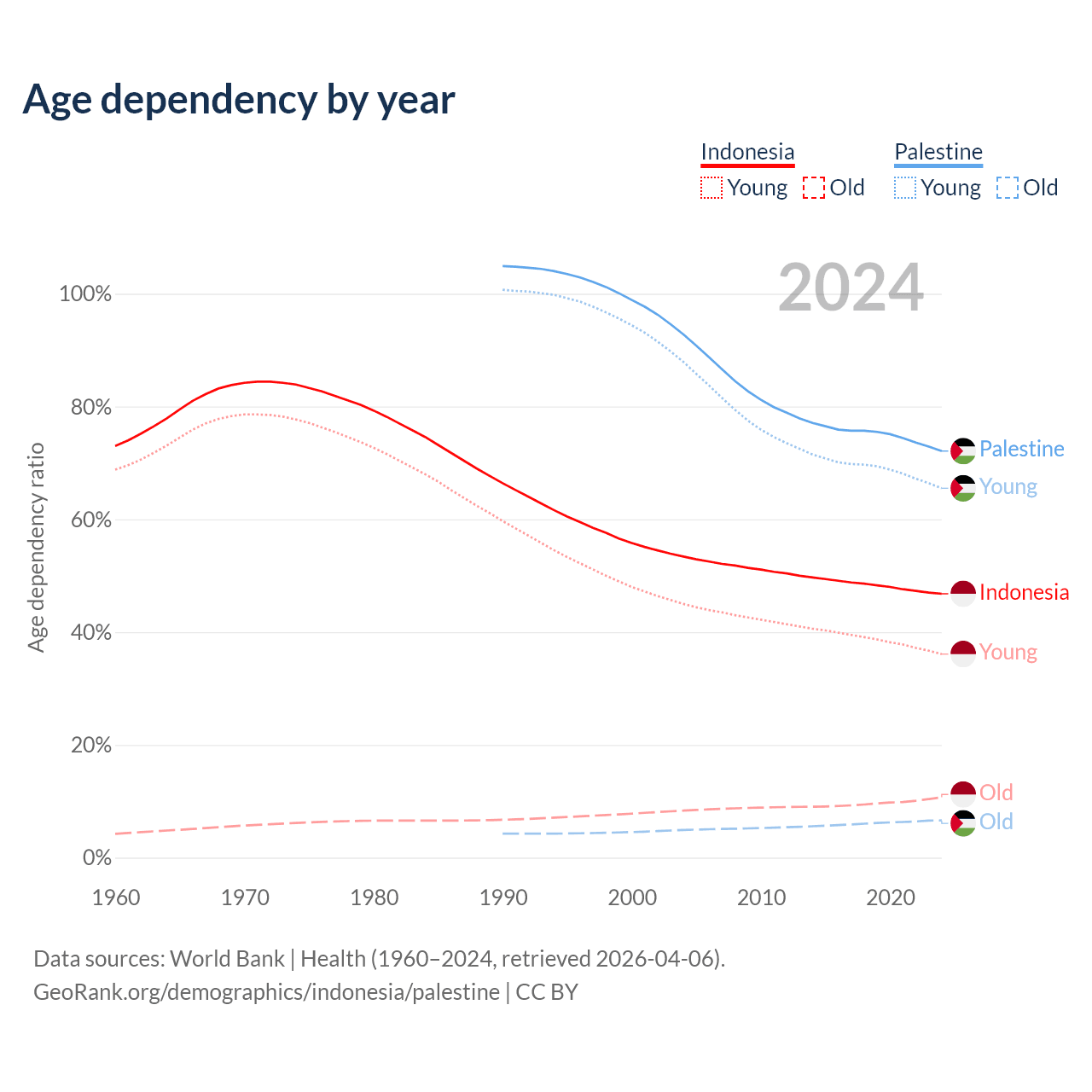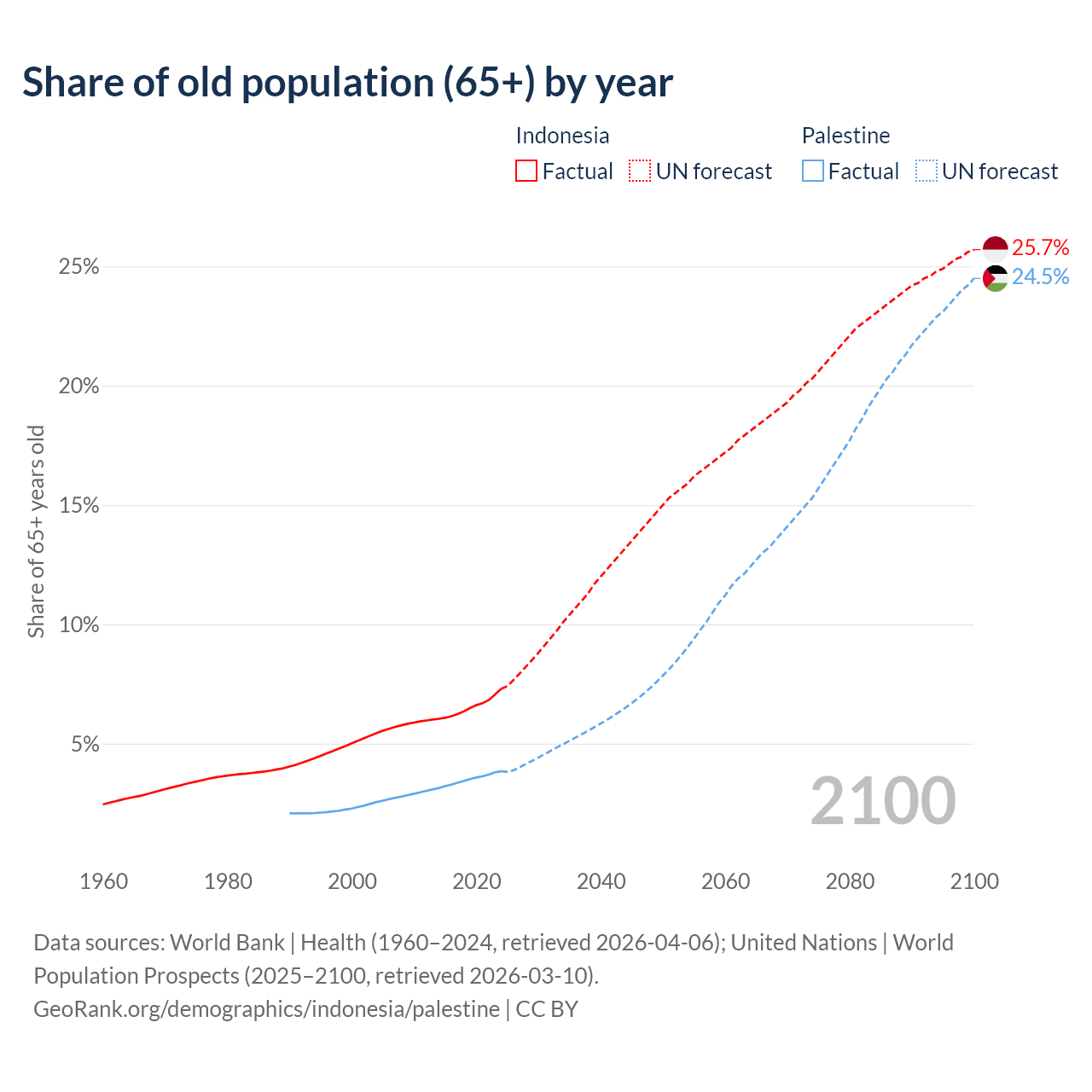- The share of old-age demographic (65+) in Indonesia is 7.29% vs 3.84% in Palestine.