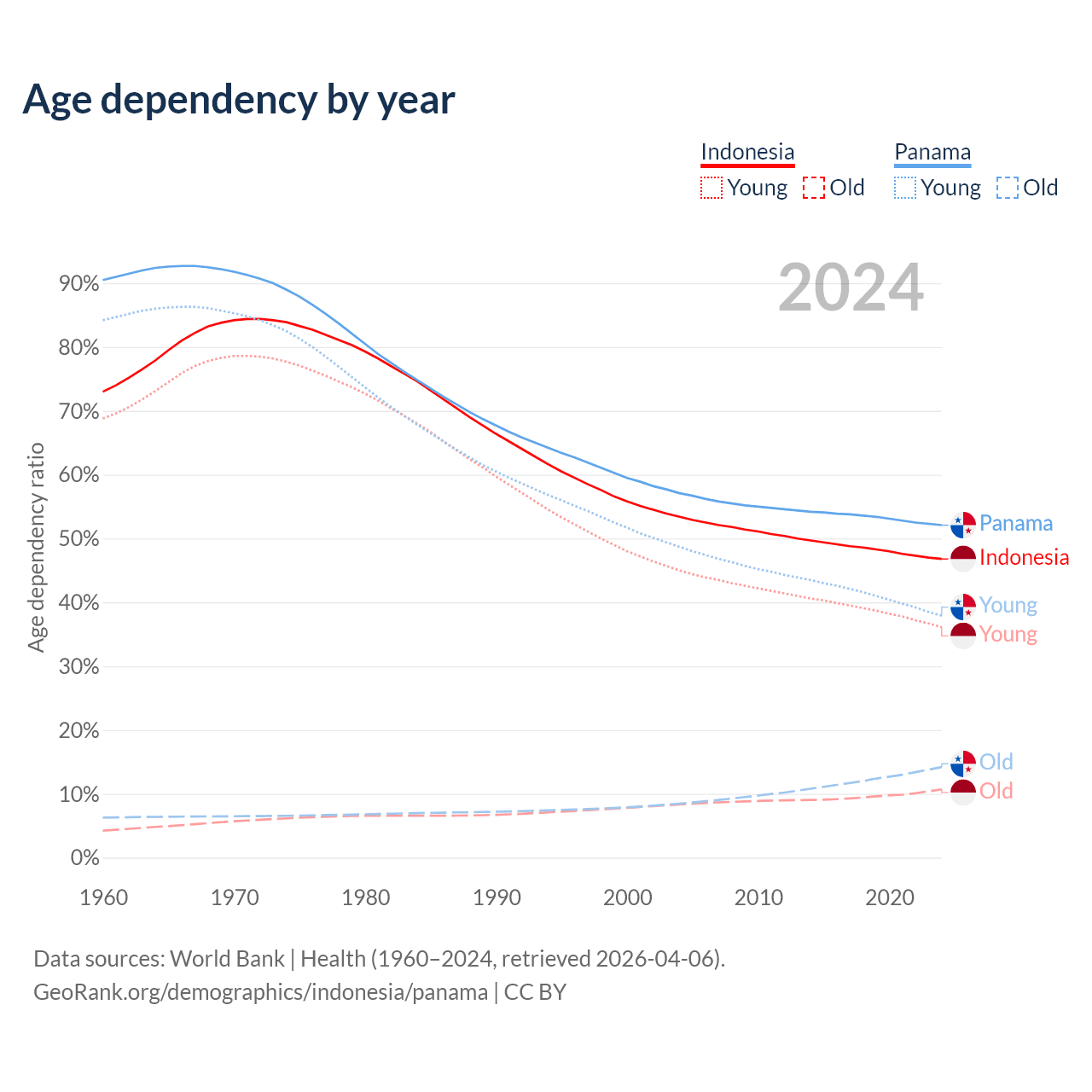 Data sources: World Bank | Health (1960–2024, retrieved 2026-04-06); U.S. Census Bureau (1960–2024, retrieved 2026-02-08).
