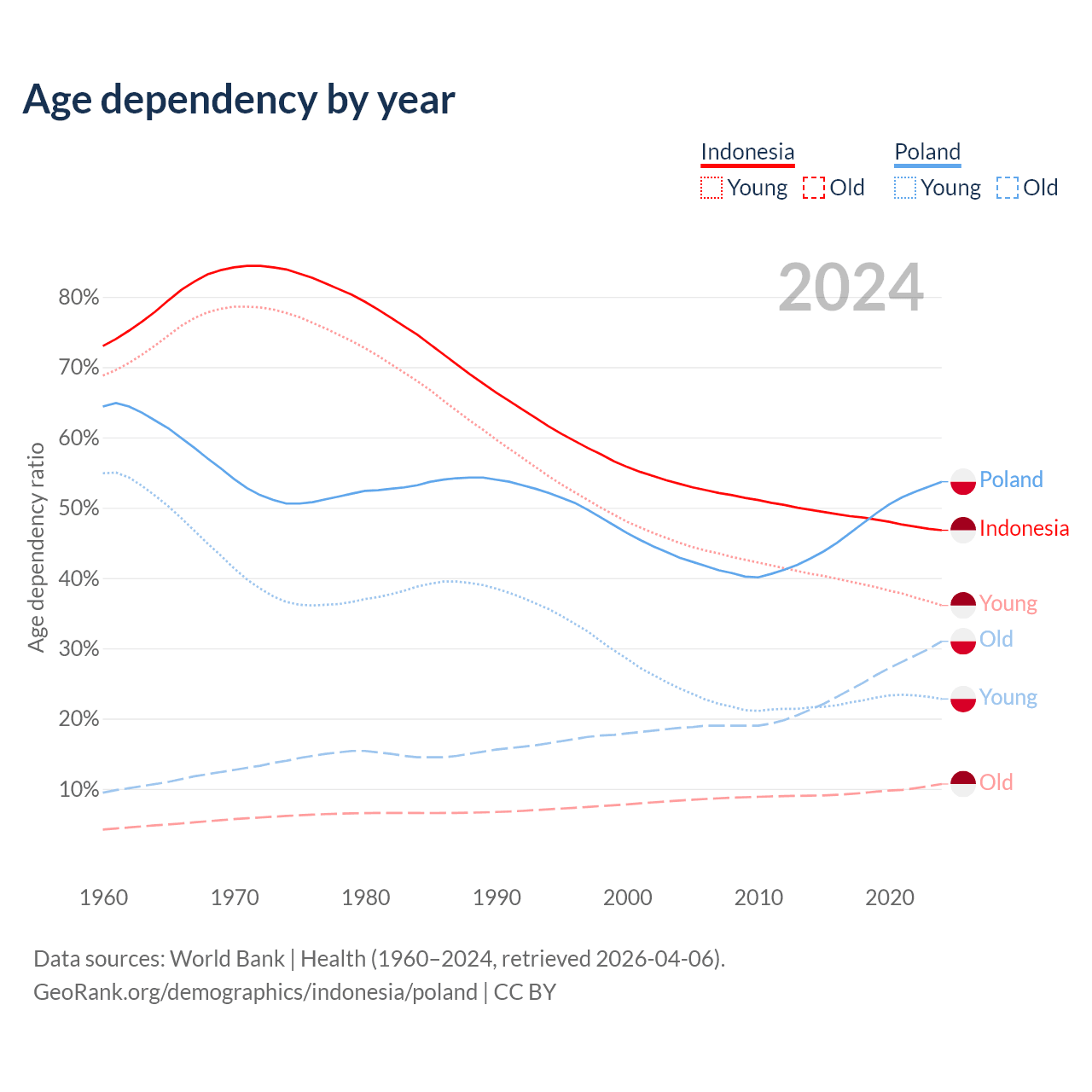 - Indonesia is ranked 93/196 by median age (oldest to youngest) vs 30/196 for Poland.