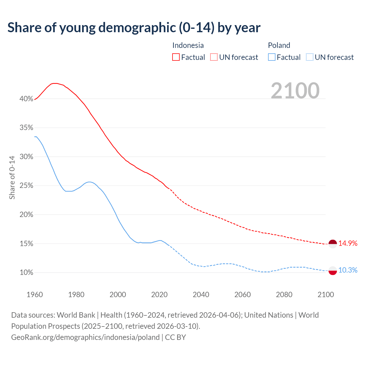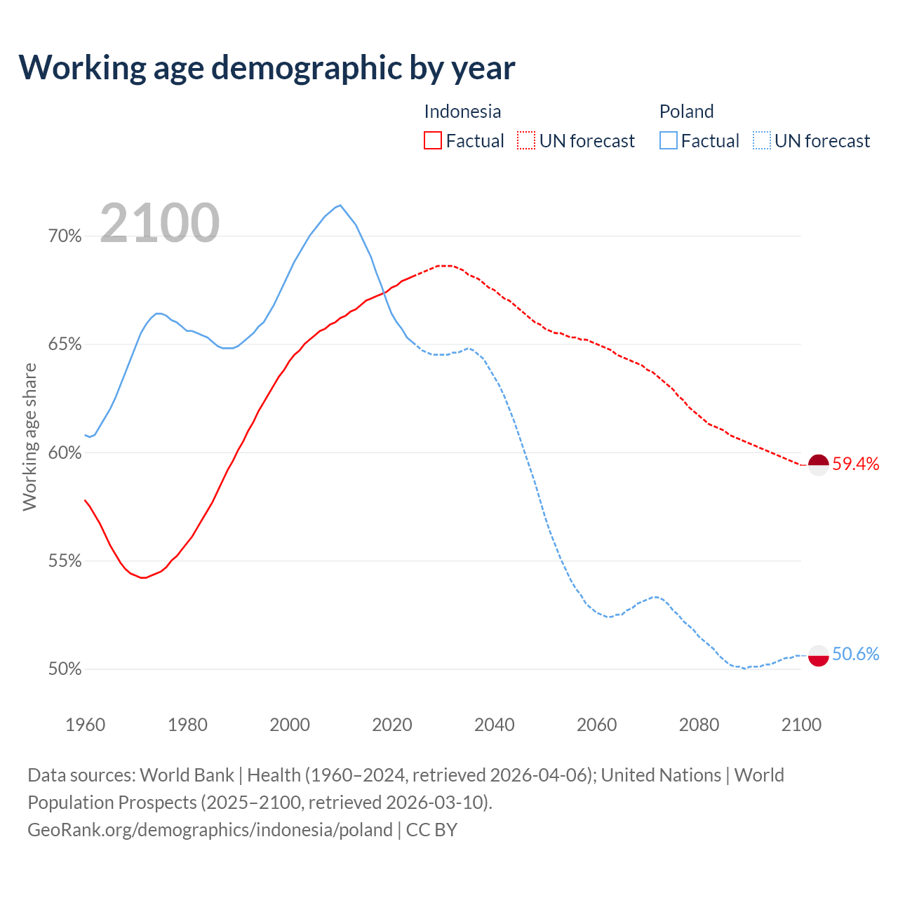 Median age Indonesia vs Poland, 1960-2100