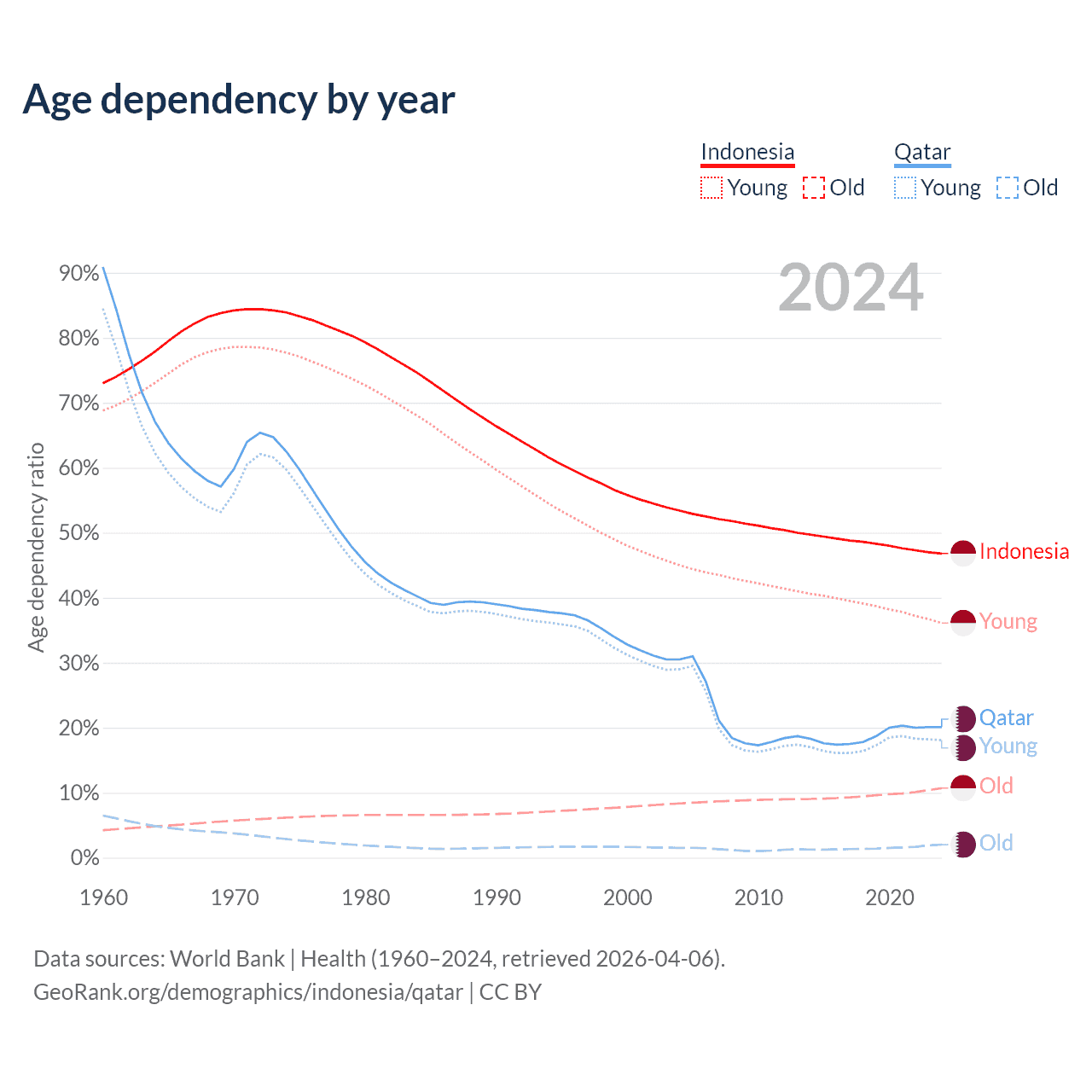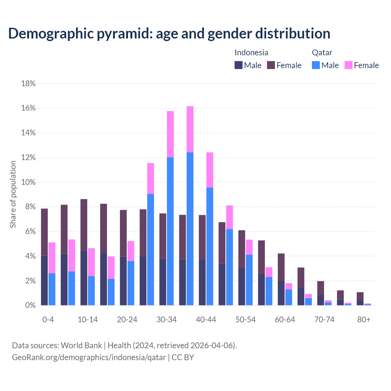 - Indonesia is ranked 93/196 by median age (oldest to youngest) vs 78/196 for Qatar.