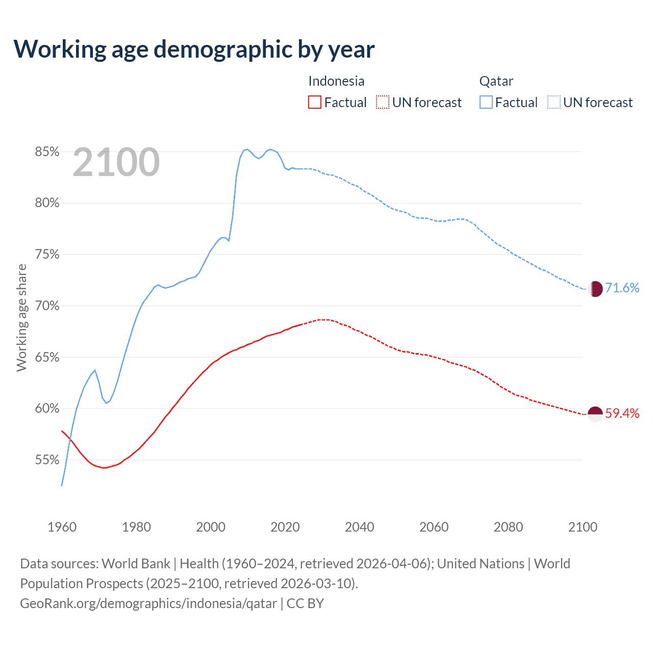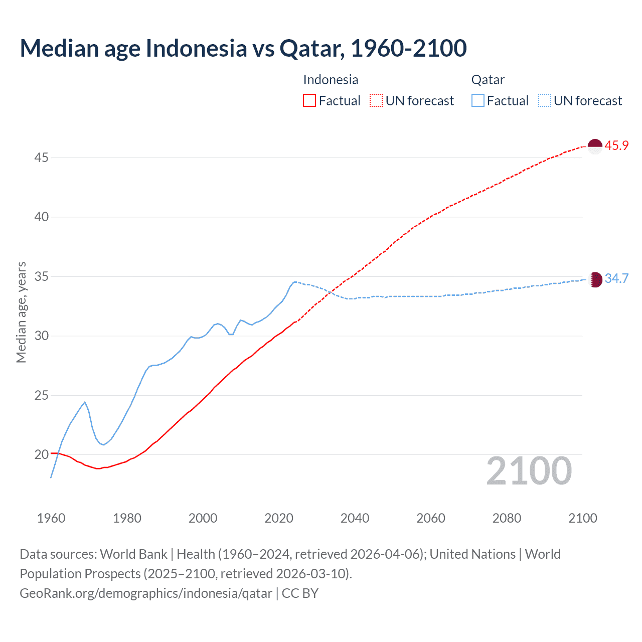 Median age Indonesia vs Qatar, 1960-2100