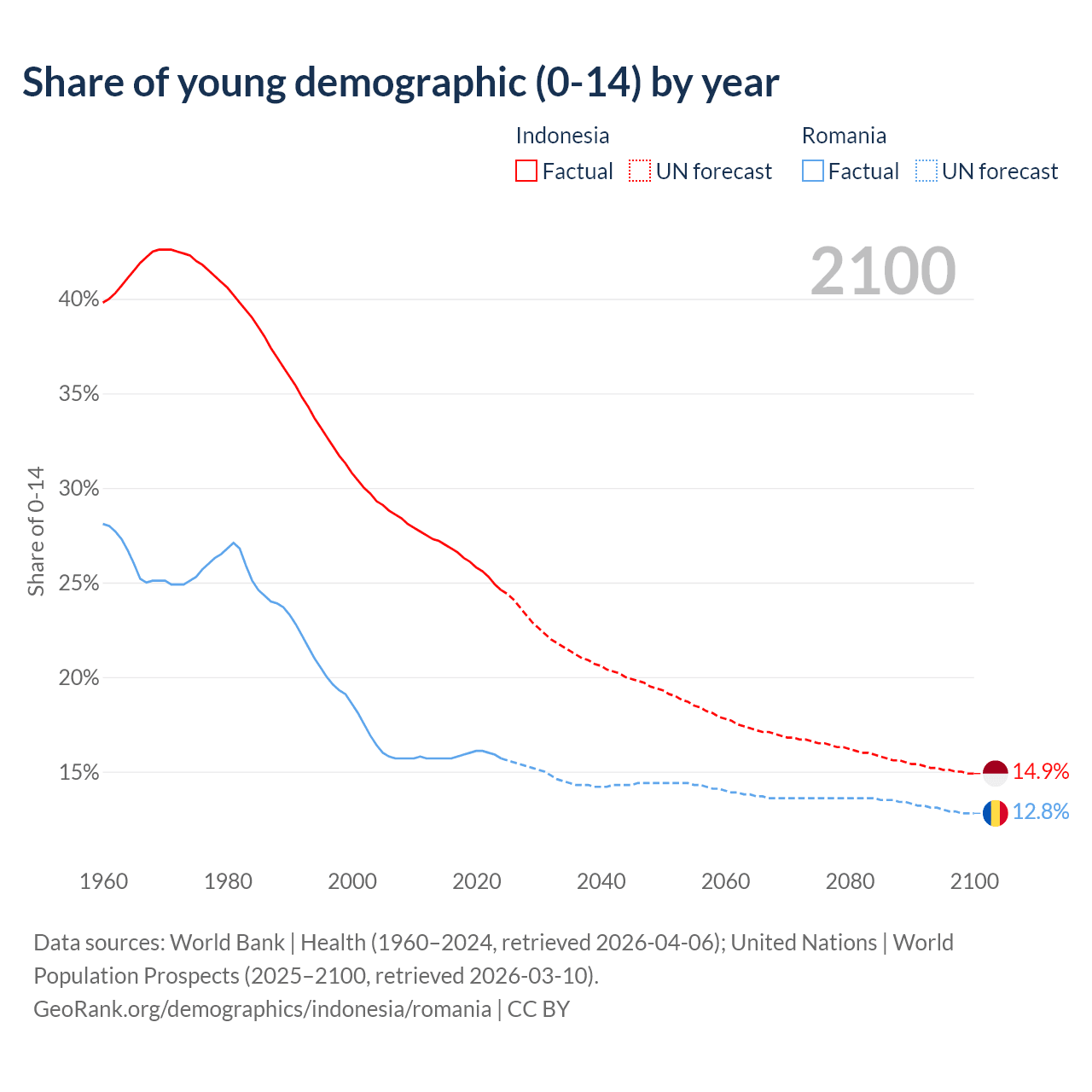 - The total fertility rate is 2.13 in Indonesia compared to 1.71 in Romania.