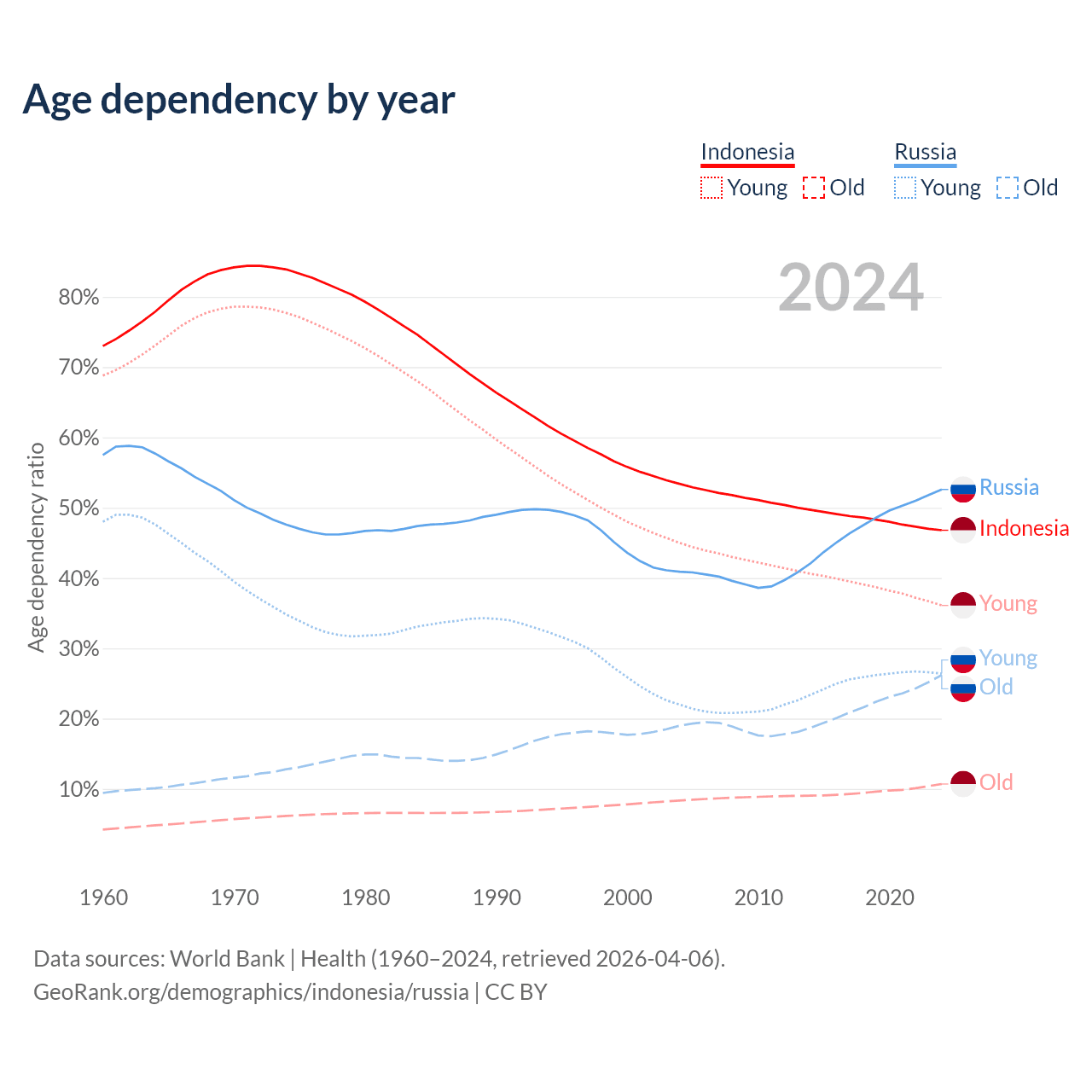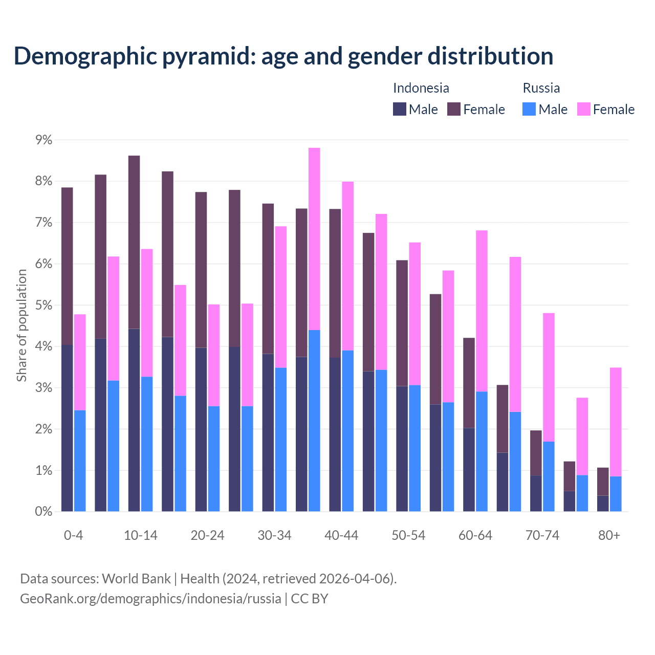 - Indonesia is ranked 93/196 by median age (oldest to youngest) vs 42/196 for Russia.