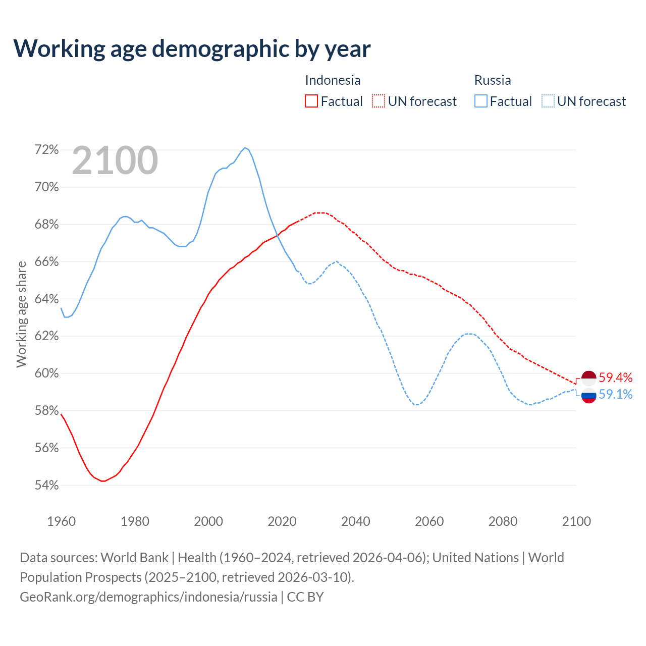 - Indonesia has 197M working age adults (aged 15-64) vs 93M in Russia.
