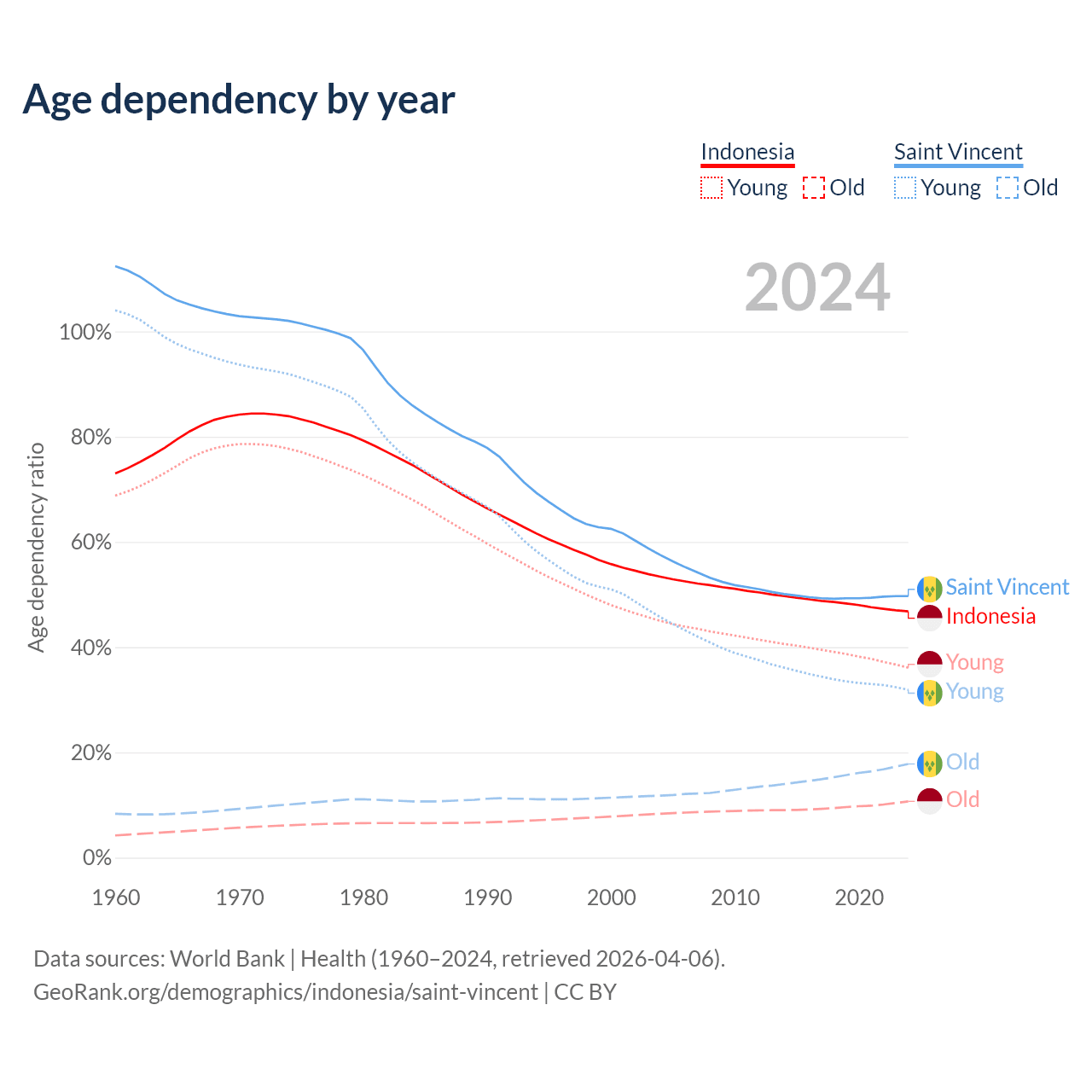 - The share of old-age demographic (65+) in Indonesia is 7.29% vs 11.9% in Saint Vincent.