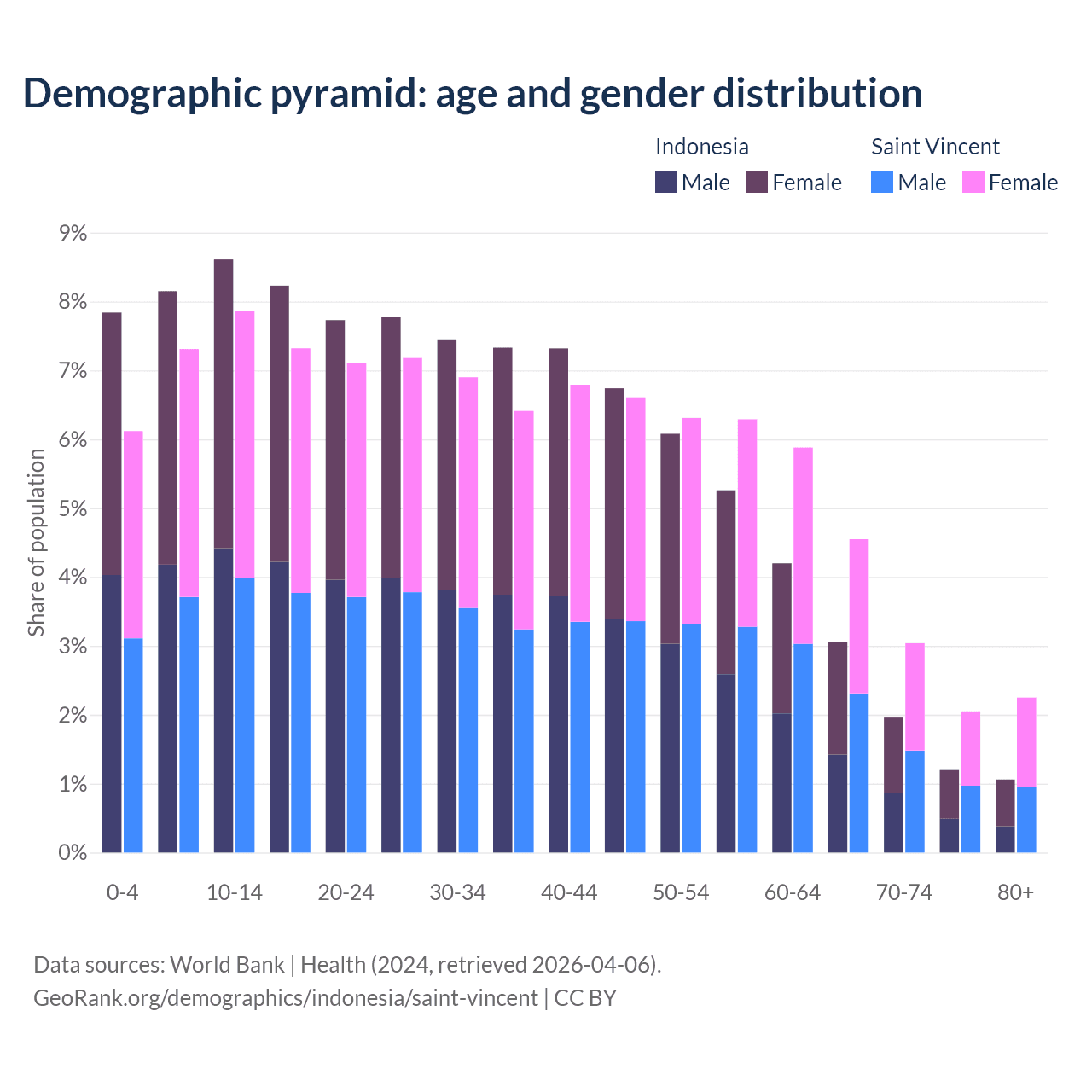 - Indonesia is ranked 93/196 by median age (oldest to youngest) vs 75/196 for Saint Vincent.