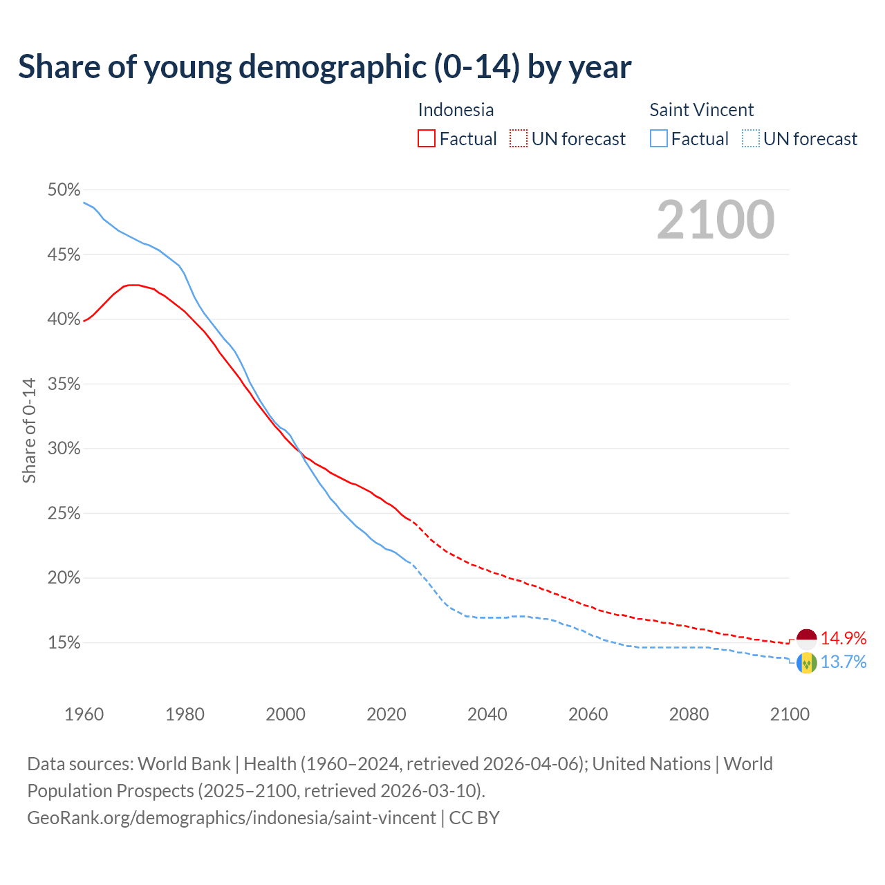 - The share of young demographic (0-15 years old) in Indonesia is 24.6% vs 21.3% in Saint Vincent.